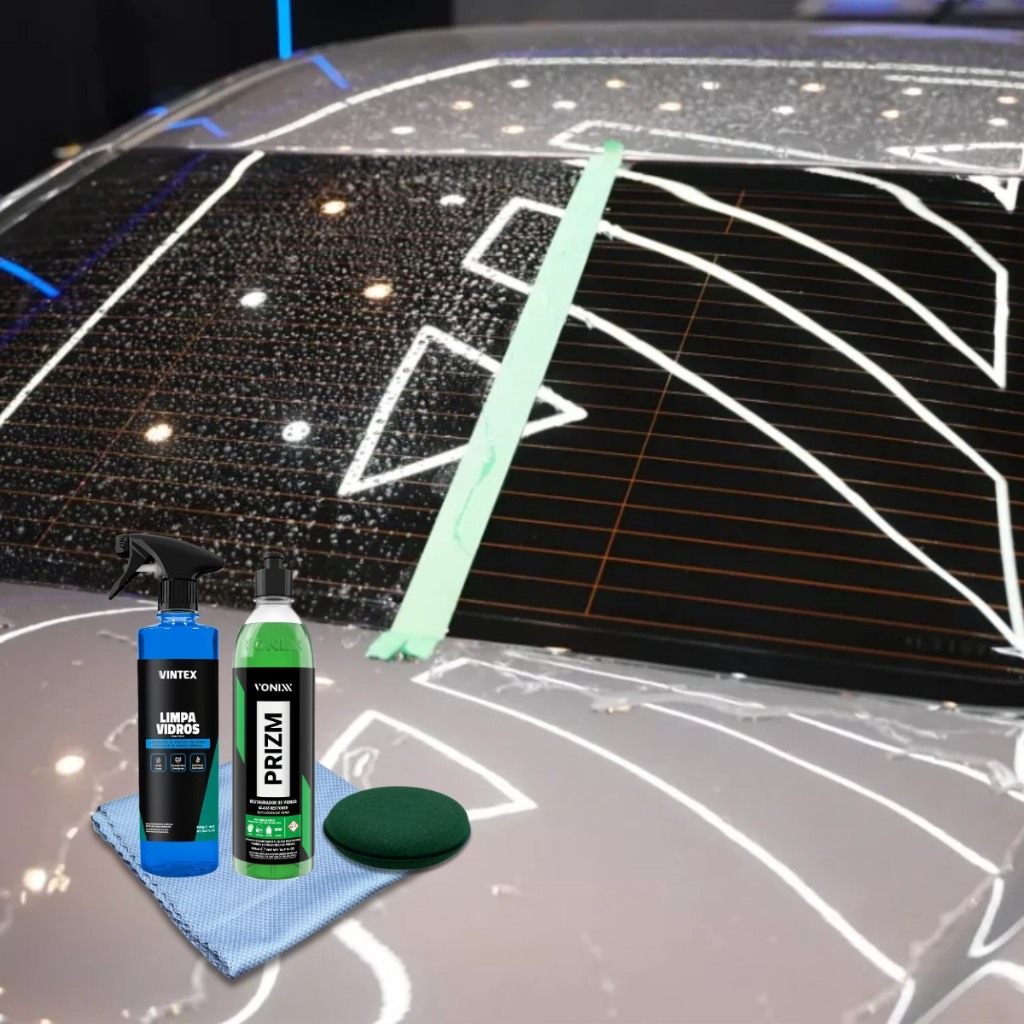 Prizm restaura a transparência em vidros automotivos remove marcas de água incrustadas, impurezas e contaminantes que não saem com a limpeza convencional. O produto age quimicamente contra as manchas e sujeiras, removendo-o facilmente de para-brisas, vidros laterais e traseiros. O Limpa Vidros é um produto formulado para limpar, remover manchas, desengordurar e desembaçar vitrines, vidros de automóveis e espelhos. Conteúdo da embalagem: 1 Prizm 500ML 1 Limpa Vidros 500ML 1 Aplicador 1 Pano Limpeza de Vidro 1 Par de luva preta Diluição: Pronto uso Importante O produto não pode ser aplicado em espelho automotivos Ao manusear o Prizm, sugerimos as seguintes orientações: -Use luvas de látex nitrílico durante todo o processo de aplicação do produto -Não deixe o produto escorrer para a pintura, pois poderá causar manchas irreversíveis -É altamente recomendado realizar teste em uma pequena área dos vidros para verificar o resultado da aplicação antes de começar a usar o produto -Evite que o produto seque sobre a superfície aplicada. Caso aconteça, umedeça a toalha de microfibra novamente e reaplique -Mantenha o produto em sua embalagem original e não a reutilize -Conserve o prizm fora do alcance de crianças e animais domésticos -Brilho intenso e duradouro -Total proteção Modo de uso Prizm: 1. Fazer um teste em uma pequena área para verificar o resultado 2. Aplicar pequena quantidade do produto em toalha de microfibra 3. Esfregar no vidro fazendo movimentos laterais de vai e vem exercendo pressão moderada, em área não superior à 60 x 60 cm por pelo menos 40 segundos, sem deixar o produto secar 4. Caso seque, umedecer a toalha de microfibra novamente e reaplicar. Enxaguar em seguida com água em abundância Modo de uso Limpa Vidros: 1. Pulverize o produto diretamente nos vidros(internos ou externos) 2. Espalhe o produto utilizando uma toalha de microfibra específica para limpeza de vidros 3. Antes que o produto seque, utilize uma outra microfibra limpa e seca para fazer o acabamento final até obter total visão