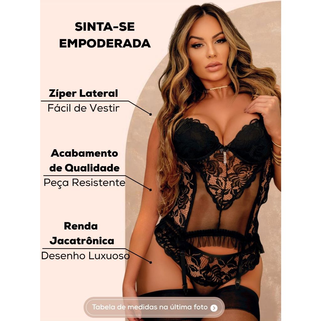 | Lingerie Espartilho Corset Sensual Zíper Lateral Completo Renda Del... este produto | R$ 134,90 | 16% | 4.8/5 | 105 |