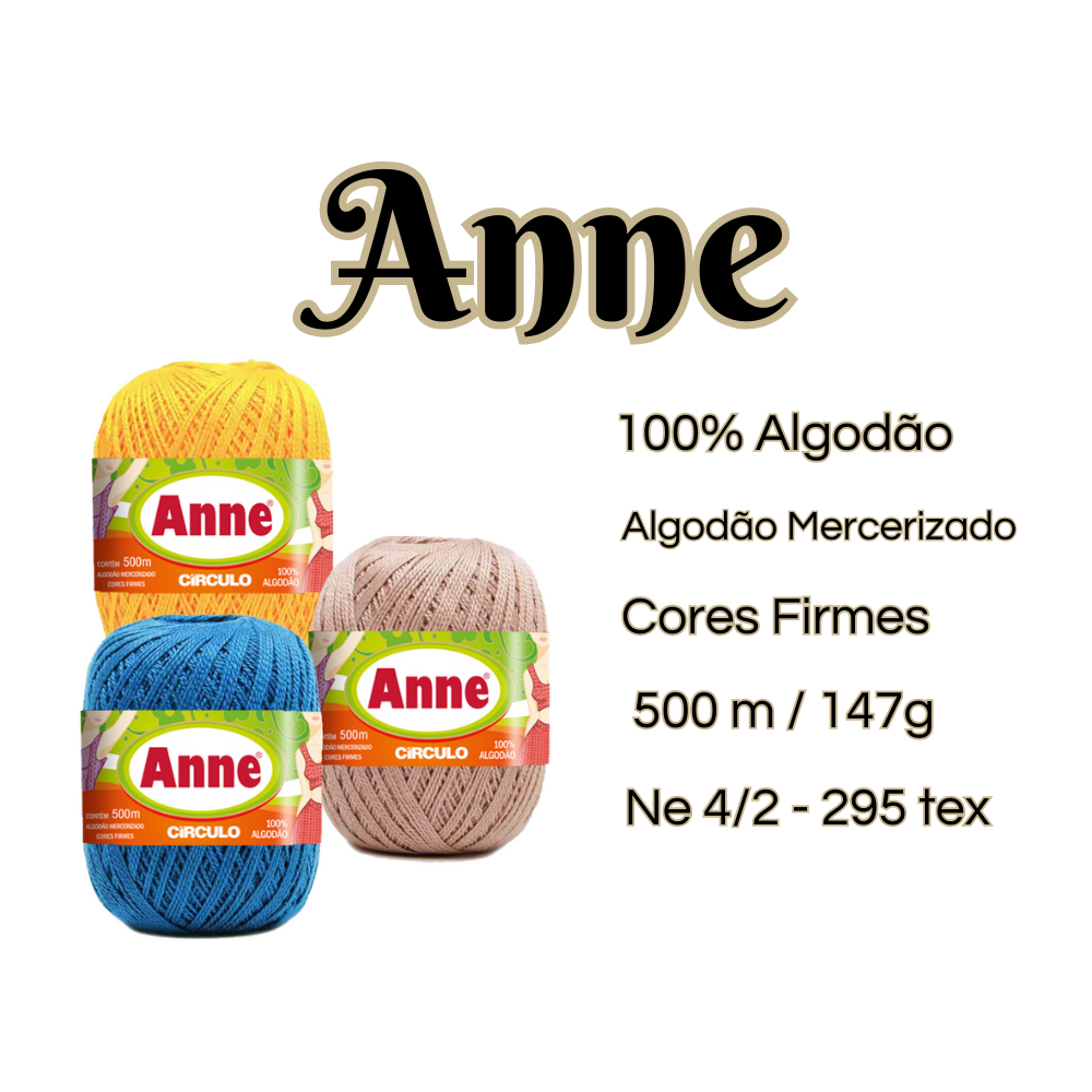 Linha Anne 500m DESCRIÇÃO O fio Anne é um produto 100% algodão mercerizado, que proporciona acabamento cintilante e toque macio a sua confecção. Quando trabalhado com pontos mais fechados para meia estação e inverno, mantém a sua peça leve e suave. Na decoração é indicado principalmente para confecção de trilhos de mesa, toalhinhas decorativas, barrados em toalhas e panos de copa, pois possui um excelente rendimento. Cor: 8990 - PRETO DADOS TÉCNICOS Fio Ne 4/2 - (295 Tex) Composição: 100% Algodão Mercerizado Comprimento e Peso: 500 m, 147 g Agulha Para Crochê: 1,75 mm Agulhas Para Tricô: 3,0 mm e 3,5 mm Regulagem Para Máquina de Tricô: 8 Fabricante: Círculo