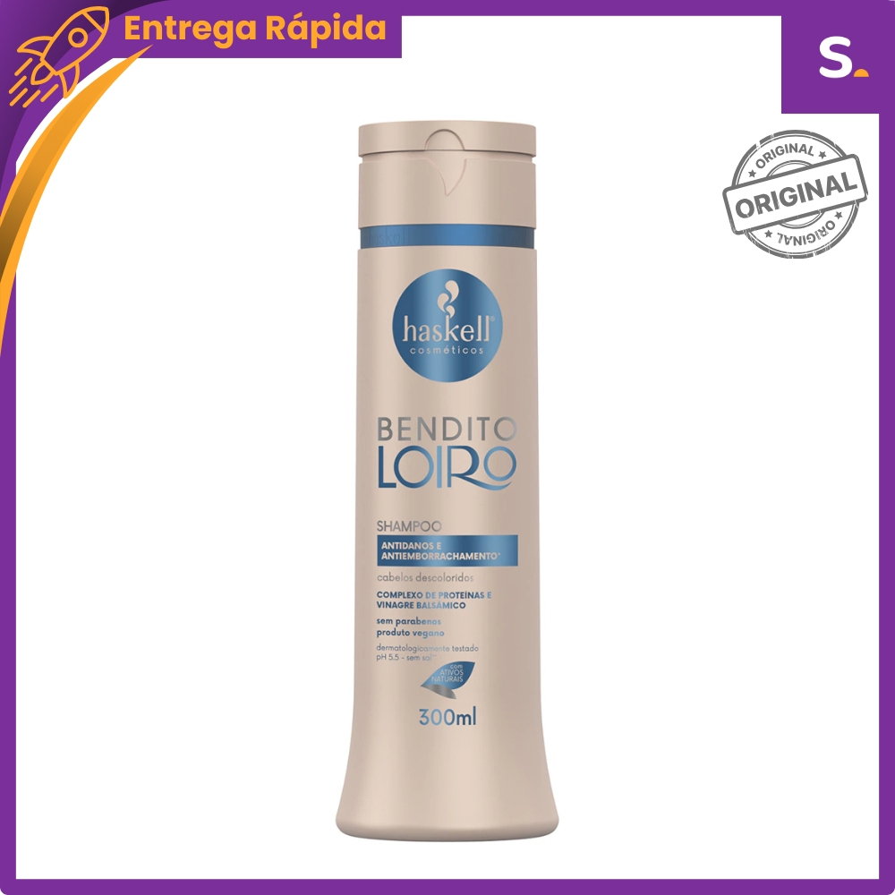 A linha Bendito Loiro da Haskell foi desenvolvida especialmente para cabelos loiros naturais, descoloridos, com mechas ou grisalhos. Sua fórmula com vinagre balsâmico e fito complexos atua na neutralização dos tons amarelados, enquanto hidrata, reconstrói e devolve brilho intenso aos fios fragilizados por química. Ideal para manter o loiro frio, saudável e luminoso no dia a dia, com tratamento completo desde a lavagem até a finalização. Escolha sua variação: Shampoo Matizante 300ml Limpa suavemente enquanto neutraliza reflexos amarelados já na lavagem. Mantém o tom frio e protege contra o desbotamento. Condicionador Matizante 300ml Desembaraça, hidrata e sela as cutículas. Promove maciez, brilho e ação antioxidante. Máscara Matizante 300g Tratamento profundo que nutre, reconstrói e intensifica o tom frio dos fios. Ideal para manutenção do loiro radiante. Fluído Matizador 120ml Finalizador sem enxágue com proteção térmica e ação antioxidante. Ajuda a proteger contra calor e agressões externas. Proteína Capilar 150g Pré-tratamento reconstrutor que fortalece a fibra capilar antes do shampoo, reduzindo danos e quebra. Benefícios da Linha: Neutraliza tons amarelados Hidrata e reconstrói fios descoloridos Protege contra agressões externas Devolve brilho e maciez Fórmulas veganas Sem parabenos Cruelty-free Perfeita para manter o loiro bonito, saudável e com efeito profissional todos os dias.