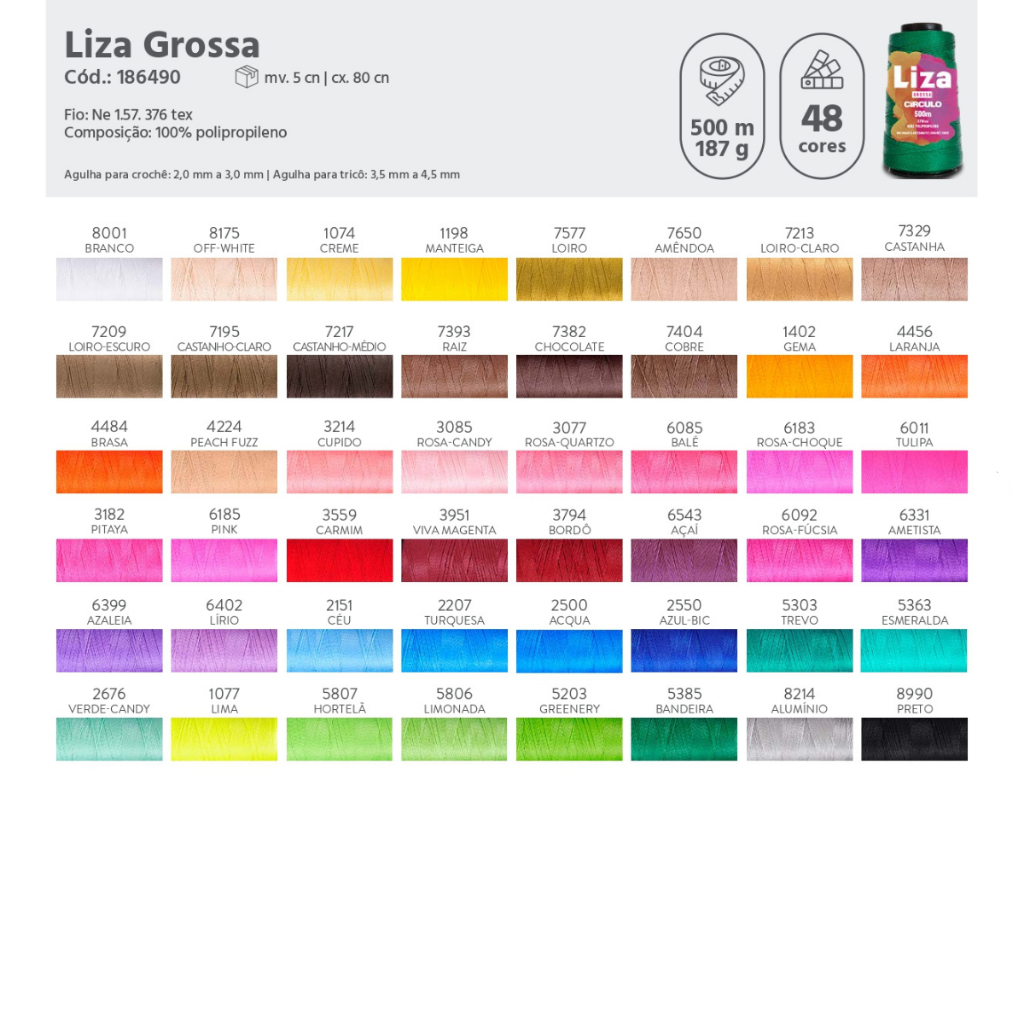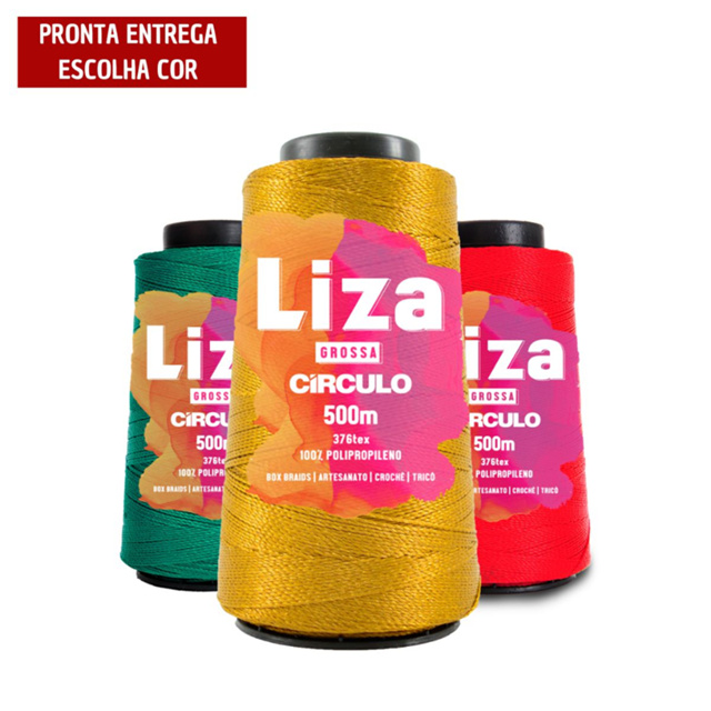✨ Fio Liza Grossa – Alta resistência e cores vibrantes para seus projetos de crochê e tricô O Fio Liza Grossa é perfeito para quem busca praticidade, durabilidade e beleza nas peças feitas à mão. Com 100% de polipropileno, ele alia leveza e resistência, ideal para criar bolsas, cintos, peças decorativas e muito mais com resultado profissional. Espessura: Ne 1,57 (376 tex) Quantidade por unidade: 500 m / 187 g Agulhas indicadas: • Crochê: 2,0 mm a 3,0 mm • Tricô: 3,5 mm a 4,5 mm Cores disponíveis: até 48 tons vibrantes para combinar com seu estilo e projeto Fabricante: Círculo