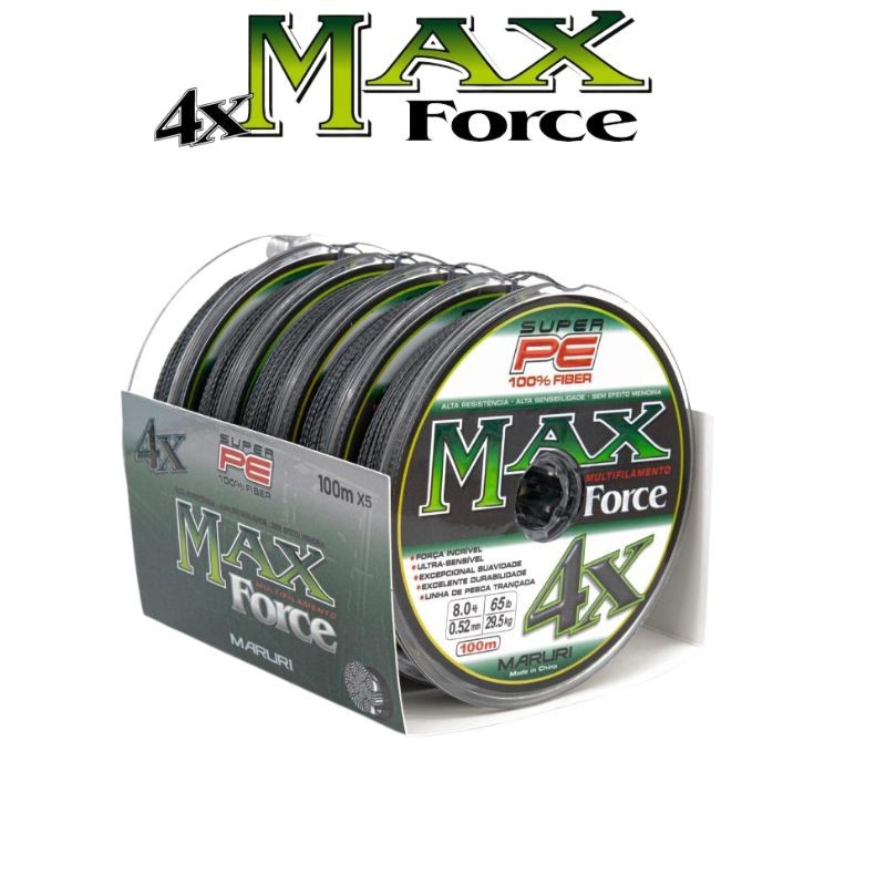 PRODUTO ORIGINAL, NA EMBALAGEM, COM NOTA FISCAL E GARANTIA. ANÚNCIO REFERE-SE A 1 CARRETEL DE LINHA MARURI MAX FORCE 4X CINZA. Max Force 4X carretel com 100m cinza da MARURI é uma linha de pesca multifilamento trançada, com excelente durabilidade, excepcional suavidade, ultra sensível e com uma força incrível, além de não possuir elasticidade e sem memória. Marca: Maruri Modelo: Max Force 4X Grey Multifilamento Carretel: 100 metros 0.140mm || 18lb || 8.2Kg 0.180mm || 21lb || 9.5Kg 0,200mm || 25lb || 11.1Kg 0,230mm || 30lb || 13.6Kg 0,260mm || 39lb || 17.7Kg 0,300mm ||44lb || 20.0Kg 0,350mm || 48lb || 21.8Kg 0,400mm || 53lb || 24.1Kg 0,450mm || 58lb || 26.4Kg 0,520mm || 65lb || 29.5Kg 0,600mm || 70lb || 31.8Kg 0,700mm || 90lb || 40.8Kg Na compra de 2 ou mais carretéis da mesma espessura, garantiremos todos interligados. Produto à pronta entrega, postaremos em até 24 horas após a confirmação do pedido. Caso tenha alguma dúvida, por favor contate-nos. Muito obrigado.