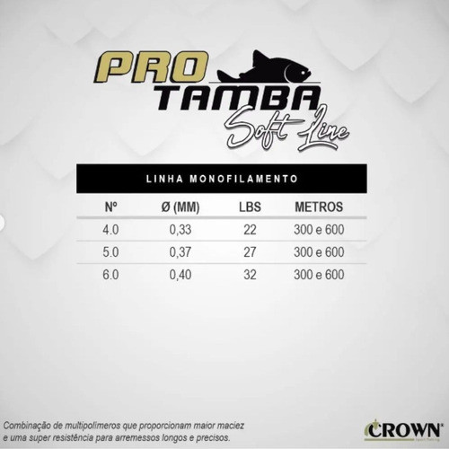 LINHA MONOFILAMENTO PRO TAMBA Com alta tecnologia numa combinação de multipolímeros que proporcionam uma linha de maior maciez, resistência e baixíssima memória para arremessos longos e precisos, a Pro Tamba Soft Line é a novidade do momento da Crown, uma linha monofilamento ideal para pesca em pesqueiros! Disponível em embalagens individuais de 300 metros Especificações técnicas: Número: 5.0 Bitola: 0,37 (MM) Libras: 27 Metros: 300 Material: 100% Nylon Validade: Indeterminado