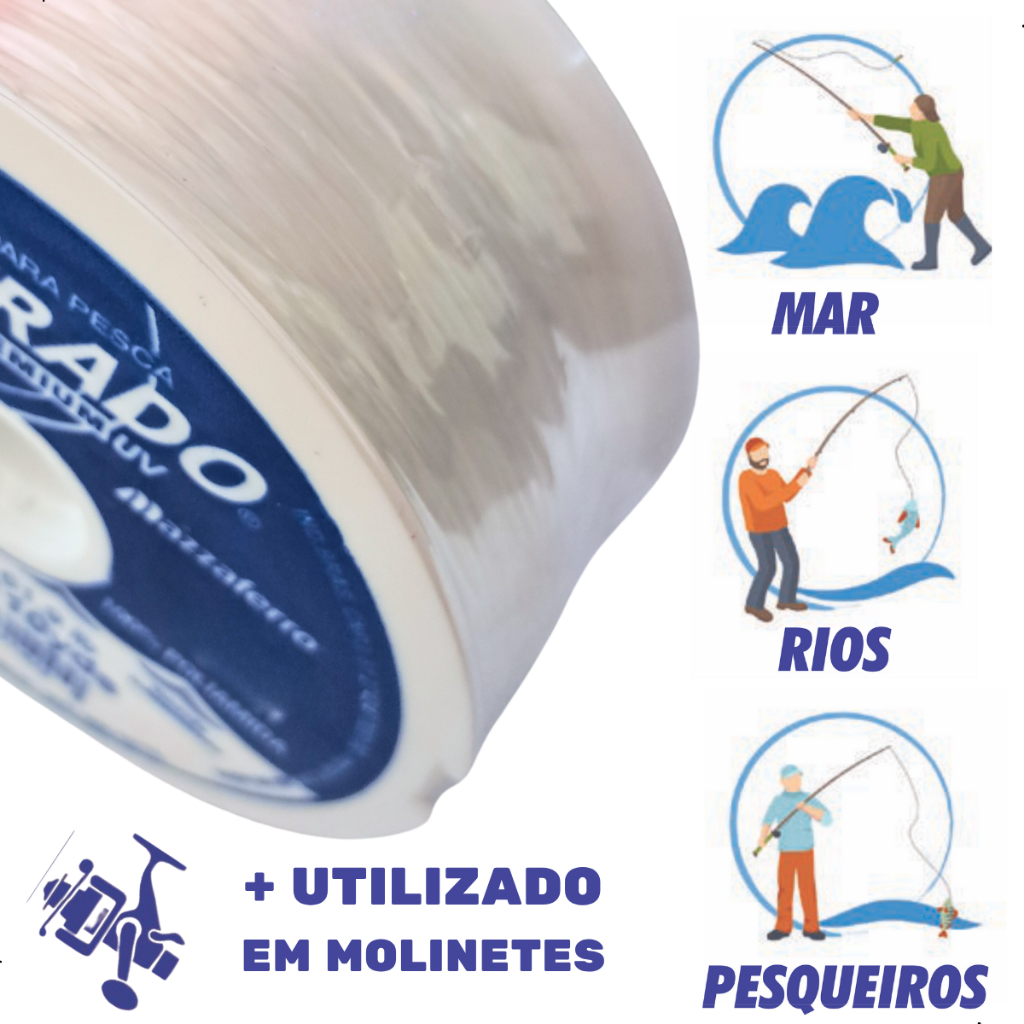 Linha Dourado Premium UV Monofilamento Mazzaferro é produzida em copolímero de nylon e desenvolvida para atender pescadores amadores e profissionais. Possui diâmetro uniforme, sem nós ou emendas, oferecendo resistência ideal para pesca com vara, confecção e reparo de redes, além de ser indicada para a fabricação de chicotes e leaders. Apresenta alta resistência ao corte e mantém firmeza mesmo com o nó molhado. É uma linha versátil e durável, que combina desempenho e ótimo custo-benefício, ideal para pesca esportiva ou uso profissional. Especificações: Marca: Mazzaferro Modelo: Dourado Premium Tratamento: UV Tipo: Monofilamento Material: Copolímero de nylon Bobina: Cada com 100m Cor: Branca/transparente Espessura x Quilos x Libras x Comprimento Total 0.20mm x 2,3kg x 5,1lb x 2.000m 0.25mm x 3,6kg x 7,9lb x 2.000m 0.30mm x 4,8kg x 10,6lb x 2.000m 0.35mm x 6,0kg x 13,2lb x 2.000m 0.40mm x 7,8kg x 17,2lb x 2.000m 0.45mm x 9,8kg x 21,6lb x 2.000m 0.50mm x 12kg x 26,5lb x 2.000m 0.60mm x 17kg x 37,5lb x 1.000m 0.70mm x 22,3kg x 49,2lb x 1.000m 0.80mm x 28,1kg x 61,9lb x 1.000m Cada bobina possui 100 metros. Na caixa com 10 bobinas, o total é de 1000 metros. No caixa com 20 bobinas, o total é de 2000 metros. Diferenciais: Resistente ao corte, resistente ao nó molhado, diâmetro uniforme sem nós ou emendas IMAGENS ILUSTRATIVAS