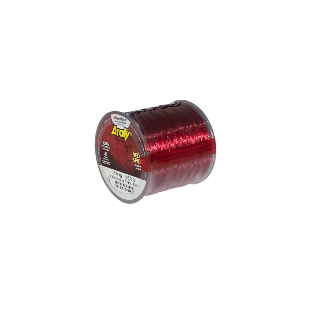 A Linha de Pesca de Monofilamento Araty Red Spider da Mazzaferro e muito recomendada para pescas em aguas claras, pois a sua cor vermelha a torna visivel fora da agua, mas embaixo da agua, o vermelho e "filtrado" dentro da agua, ficando quase totalmente invisivel a 1 (um) metro de profundidade. A sua alta sensibilidade e dada por ter elasticidade super baixa, permitindo que o pescador saiba a hora certa de fisgar o peixe. Possui boa resistencia linear e a abrasao. Feita de poliamida (nylon). Possui Protecao Anti-UV, garantindo longa durabilidade. Validade indeterminada. Produto improprio para uso cirurgico. Preco unitario; - Carretel de 100 gramas; - Carretel com: 719 metros; - Resistencia: 23,8 libras ( 10,8 kg); - Principais utilidades: tarrafas, redes, pesca de canico, linha de mao; - Utilidades secundarias: Artesanatos, molinete, carretilha; - Cor vermelha com alta transparencia; - Resistente a abrasao.