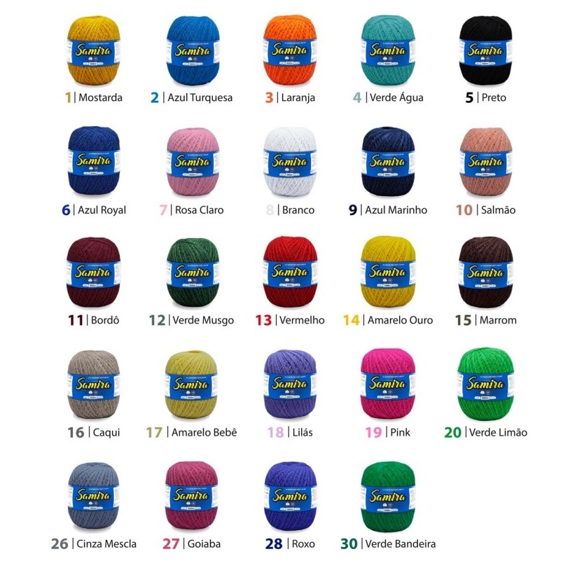 Importante: Não cancelamos pedidos então siga as instruções abaixo; 1- Antes de comprar verifique a disponibilidade das cores via chat. 2- Aguarde a confirmação do vendedor e faça sua compra. 3- Se o cliente comprar antes de informar as cores no chat e a loja não tiver alguma cor em estoque serão enviadas sortidas. 4- Caso o cliente não escolha as cores serão enviadas cores sortidas. Produto composto por 85% algodão e disponível em mais de 20 opções de cores, a linha Samira é um produto de fácil manuseio, ideal para trabalhos leves e delicados como bicos de pano de prato, toalhas de mesa etc. Composição: 85% Algodão Comprimento:1000 metros Cores:25 cores Fio: Ne 8/2 - Tex 147,6