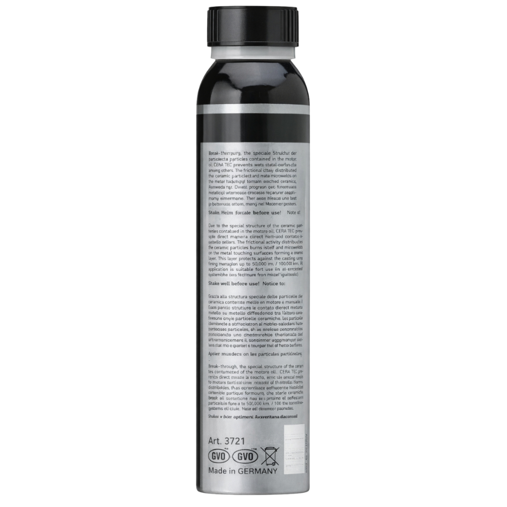 Liqui Moly Cera Tec 300 ML Este anúncio contem: 01 - Liqui Moly Cera Tec 300 ml. Sobre o produto: Aditivo redutor de atrito de alta tecnologia baseado em nano-cerâmica high tech, se caracteriza como um aditivo sintético de última tecnologia para todos tipos de motores. Reduz o atrito e o desgaste graças a uma combinação única de compostos cerâmicos e agentes químicos redutores de atrito. Previne diretamente o contato metal com metal e reduz o atrito para aumentar a vida útil do motor, melhorando também o consumo de combustível. Pode ser aplicado também em transmissões manuais e compressores. Propriedades Reduz as perdas por atrito Pode ser usado com filtros de partículas diesel (DPF) Miscível com todos os óleos de motor disponíveis no mercado Aumenta a suavidade de operação Maior estabilidade térmica Excelente comportamento em altas e baixas temperaturas Ideal com turbocompressores e conversores catalíticos Estável sob pressões extremas Compatível com filtros finos Sem depósitos Longa vida útil do motor Quimicamente inerte Reduz o consumo de combustível Areas de Aplicação Use em motores a gasolina, flex e diesel, com ou sem turbocompressores. Miscível com a maioria óleos de motor disponíveis comercialmente. Seguro com conversores catalíticos e filtros de partículas (GPF / DPF), bem como para sistemas de correia no óleo. Observação: Não adequado para uso com embreagens úmidas (motos com embreagem acoplada ao motor)! Aplicação O conteúdo (300 mL) é suficiente para 5-6 litros óleo de motor. Efeito de longo prazo para até 50.000 km. Agitar antes de usar. Sobre a marca: LIQUI MOLY Uma marca que movimenta e entusiasma Entusiasmo – A força motriz do nosso modo de pensar e agir. Com empenho e paixão, suas ideias e os seu conhecimento, os nossos cerca de 1000 colaboradores transformaram a LIQUI MOLY naquilo que ela é hoje: um fabricante mundialmente conhecido de lubrificantes, aditivos, produtos de cuidado com o veículo e produtos de reparação, bem como produtos de serviço, adesivos e produtos selantes. Uma marca global sinónimo de qualidade máxima e entusiasmo. Uma marca mundial made in Germany. Conheça uma linha completa de produtos que cobre todas as suas necessidades: com mais de 4000 itens, oferecemos o produto adequado para todos os tipos de veículos. Desde um veículo leve, duas rodas, veículos comerciais, ou até de de equipamentos de construção, barcos ou equipamentos de jardinagem. Independentemente do seu objetivo ser a utilização eficiente para uso próprio, profissional ou industrial: as nossas soluções aumentam a vida útil de motores e agregados e asseguram a sua eficácia e o seu funcionamento durante muitos anos. Fatores decisivos que lhe permite tirar mais prazer da condução e reduzir custos de modo sustentável. As melhores matérias-primas, os controles permanentes e o cumprimento das especificações mais exigentes garantem uma qualidade imbatível e vantagens únicas. Porque, com a LIQUI MOLY, você compra mais do que um produto. Como nosso cliente, obterá o máximo de benefício acompanhado de uma assistência personalizada, um atendimento excelente e uma atenção ao cliente única. Essa é a nossa garantia. Com bom senso, muita paixão e um objetivo muito claro: o seu entusiasmo. Sobre nossa empresa: Estamos há mais de 30 anos no mercado de autopeças, buscando sempre a satisfação dos nossos clientes. Trabalhamos com as melhores marcas do ramo automotivo e aqui você encontrará as melhores peças para seu veículo, e contará com qualidade e o melhor atendimento. Nossos produtos são todos rigorosamente conferidos e embalados para que chegue até você da melhor maneira. A nossa empresa comercializa apenas produtor originais de fabricantes certificado pelo ISO 9001. Dúvidas frequentes: Nós trabalhamos apenas com produtos novos e com garantia. Nossos produtos são de qualidade original, respeitando todas as regras do fabricante. Produto a pronta entrega. Seus produtos serão enviados em até 24 horas úteis.