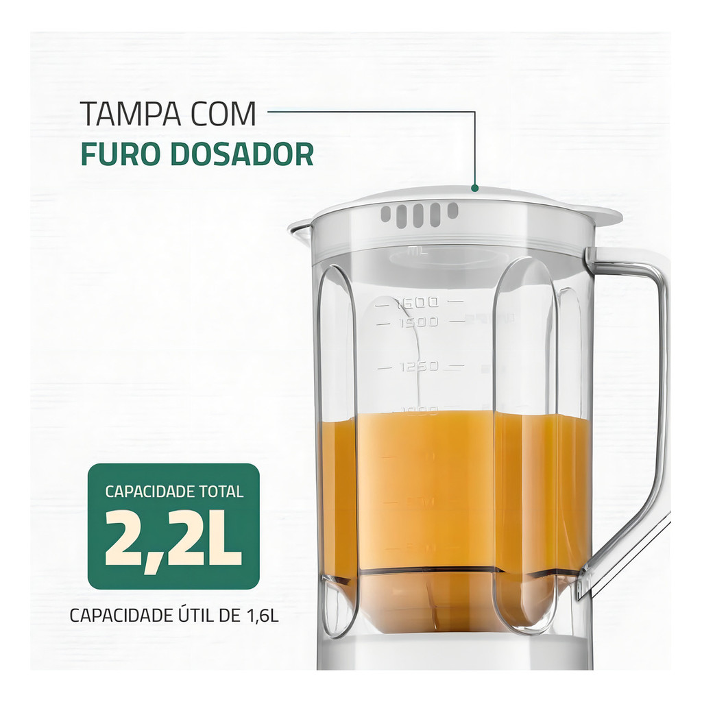 O Liquidificador 2 velocidades 550W Pratic Power da Mondial L-97-W possui um copo super-resistente, perfeito para facilitar os preparos do dia a dia na cozinha. Conta com 2,2 litros de capacidade total e 1,6 de capacidade útil, 4 lâminas em aço inox, 2 velocidades e a função Pulsar. A potência de 550W é ideal para preparar sucos, vitaminas, sopas, mousses e muito mais. Prepare suas receitas favoritas com tranquilidade, sabendo que você tem em mãos um equipamento resistente e eficiente. Saiba mais sobre o L-97-W Mondial: • COPO SUPER-RESISTENTE O copo do liquidificador Pratic Power é super-resistente a quedas e riscos, garantindo mais segurança e durabilidade. Além disso, seu novo design possui encaixe seguro, rápido e fácil. • CAPACIDADE* TOTAL: 2,2 LITROS Que tal preparar sucos, vitaminas, molhos e outras receitas para toda a família? Com a jarra de 2,2 litros, você produz grandes porções de uma vez só e economiza seu tempo. *Capacidade útil de 1,6 litros. • POTÊNCIA DE 550W Proporciona um melhor desempenho no preparo de diversas receitas. • 2 VELOCIDADES + PULSAR Escolha a velocidade ideal, conforme a receita a ser preparada. A função Pulsar é ideal para triturar gelo, polpa de fruta, smoothie e muito mais. • LÂMINAS EM AÇO INOX Práticas e eficientes, as lâminas em aço inox são afiadas e duráveis. Trituram e misturam os ingredientes com mais precisão e rapidez, garantindo resultados consistentes e precisos. • FUNÇÃO AUTOLIMPEZA Higienização rápida e prática do seu liquidificador. O resultado é um copo limpo e pronto para ser usado novamente! • GUARDA-FIO E PORTA PLUG Mais facilidade na hora de guardar o produto. • PÉS ANTIDERRAPANTES Oferece maior segurança e estabilidade durante o uso. Capacidade (Total): 2,2 litros Capacidade útil: 1,6 litros Potência: 550W Velocidades: 2 velocidades Função pulsar: Sim.