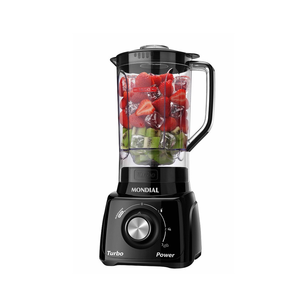Liquidificador Mondial L99FB, 3 velocidades + Pulsar 500W. Mais Capacidade. Prepare todas as suas receitas para quem você ama! Mais praticidade para você: o liquidificador Turbo possui copo super-resistente a quedas e riscos, lâmina em aço inox e tem a capacidade ideal para preparar as receitas do dia a dia. Alta Performance Muito mais potência para preparar suas receitas. O liquidificador Turbo possui uma potência constante durante o preparo das mais diversas receitas, tais como bolo, vitaminas, smoothies, cremes e sopas. Não há limites para sua criatividade! Você pode misturar o que você quiser, pois até os alimentos mais duros e consistentes podem ser triturados. Design Robusto. O liquidificador Turbo foi projetado para proporcionar segurança e estabilidade durante o preparo de diversas receitas. Conta com filtro para separação de bagaços e sementes e tampa graduada, que pode ser usada como medidor, além de um porta fio interno para facilitar seu armazenamento. Caracteristicas: Potência 500W: melhor desempenho nas receitas do dia a dia. Copo com 2,2 L de capacidade total: super-resistente a quedas e riscos. Capacidade útil de 1,6L 3 velocidades + Pulsar: escolha a velocidade ideal, conforme o tipo de ingrediente a ser preparado. Sistema de encaixe rápido: montagem fácil e prática. Função Filtro: entra a fruta e sai o suco ou molho filtrado. Faca em aço inox: mais eficiência ao triturar os alimentos. Garantia: 12 meses