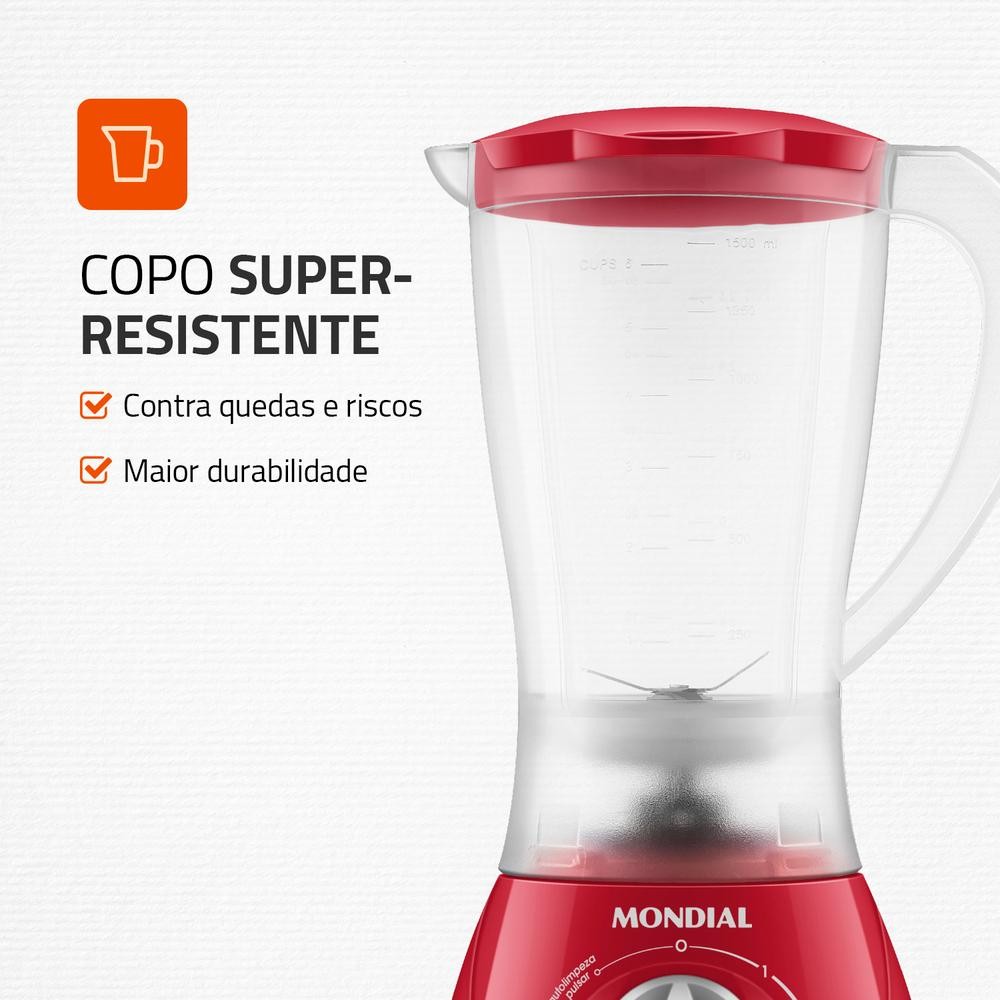 O liquidificador Mondial Easy Power 550W é um aliado na rotina na cozinha. São 550W de potência, capacidade total de 1,9 litros, além de 2 velocidades + Função Pulsar, que tritura até ingredientes mais duros. Você pode preparar torta de frango, bolo de milho, pão de queijo, massa de panqueca, queijadinha e muitas outras receitas com praticidade e rapidez. Saiba mais sobre o L-550: POTÊNCIA: 550W Permite que você misture ou triture suas receitas com maior agilidade. CAPACIDADE* TOTAL: 1,9 LITROS: Prepare sucos, vitaminas, smoothies, molhos e diversos outros pratos na porção ideal que você precisa! *Capacidade Útil de 1,5 Litros. RESISTENTE A QUEDAS E RISCOS: O copo dos liquidificadores Mondial é super-resistente e garante mais durabilidade para seu aparelho. LÂMINAS EM INOX: Trituram com mais precisão e rapidez. Além disso, não enferrujam e são mais duráveis. 2 VELOCIDADES + PULSAR: Escolha a velocidade ideal para alcançar a textura perfeita! Dica: a função Pulsar tritura ingredientes mais duros. FUNÇÃO AUTOLIMPEZA: Higienização rápida e prática do seu liquidificador. JARRA: BPA FREE + SEM CHEIRO: O material não contém Bisfenol-A, que é nocivo à saúde, e não deixa cheiro. GUARDA-FIO E PORTA PLUG