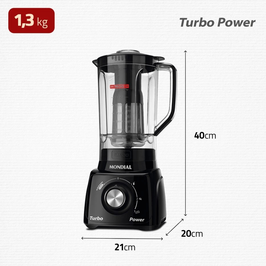 O Liquidificador Mondial Turbo Power L-99FB traz potência e praticidade para o seu dia a dia. Com 550W, 3 velocidades e função pulsar, prepara receitas com mais rapidez e eficiência. Sua jarra de 2,2L é resistente, livre de BPA e vem com filtro em inox para sucos sem bagaço. Ideal para vitaminas, bolos, molhos e muito mais, garantindo praticidade e durabilidade. CARACTERÍSTICAS: — 550W de potência para triturar e misturar com eficiência — Jarra San Cristal resistente, 2,2L total (1,6L útil) — Filtro em inox que separa bagaço e sementes — 3 velocidades + função pulsar para diferentes preparos — Função autolimpeza para higienização prática — Lâminas de inox duráveis e precisas — Tampa com copo dosador para adicionar ingredientes facilmente — Material livre de BPA e sem cheiro ESPECIFICAÇÕES TÉCNICAS: Marca: Mondial Modelo: Turbo Power L-99FB Cor: Preto Potência: 550W Voltagem: 127V Velocidades: 3 + Pulsar Capacidade Total: 2,2L Capacidade Útil: 1,6L Material do Copo: San Cristal (BPA Free) Filtro: Sim (em inox) Função Autolimpeza: Sim Função Pulsar: Sim Lâminas: Inox Itens Inclusos: 1 filtro em inox Peso: 2,00 kg DIMENSÕES DO PRODUTO: Comprimento: 20 cm Largura: 21 cm Altura: 41 cm Peso: 2,00 kg DICA DO MINEIRINHO: Com 550W de potência e função pulsar, o liquidificador dá conta de massas leves e médias, além de vitaminas e molhos, como bolo e pão de queijo. DÚVIDAS FREQUENTES: — O copo é de vidro ou plástico? É de San Cristal, um plástico resistente, livre de BPA, que não pega cheiro e é mais leve que o vidro. — O filtro precisa ser comprado separadamente? Não, ele já acompanha o produto e é feito em inox, garantindo mais durabilidade. — A jarra é fácil de limpar? Sim, além de ser resistente, o modelo conta com função autolimpeza, facilitando a higienização no dia a dia. ITENS INCLUSOS: — 01 Liquidificador Mondial Turbo Power L-99 FB 550w Preto - 127v IMAGENS MERAMENTE ILUSTRATIVAS. O prazo de devolução, conforme o artigo 49 do CDC (Código de Defesa do Consumidor), é de 7 dias corridos a partir do recebimento do produto. Recomenda-se que a devolução seja feita com o produto em perfeitas condições, sem danos ou marcas de uso, utilizando uma embalagem protetora original. A ausência dessa embalagem ou danos a ela podem resultar na recusa da devolução. A Garantia Legal é de 90 dias, conforme o CDC - Código de Defesa do Consumidor. Após esse prazo, passa a vigorar a Garantia Contratual, que é tratada diretamente pelo FABRICANTE do item e segue as regras estipuladas pelo próprio. A Garantia Total (garantia legal + garantia contratual) é exibida no campo correspondente deste anúncio. Atente-se à responsabilidade de cada parte e lembre-se que estamos sempre a disposição para esclarecimentos em nosso SAC.