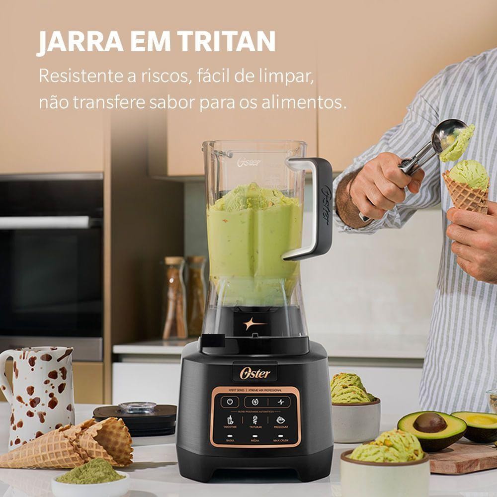 Liquidificador Oster Profissional Xtreme Mix 2L BLSTXPT-BW 220V Liquidificador Oster Xtreme Mix: Potência e Inovação para Suas Receitas! Com lâminas revestidas com titânio, motor reversível de 1500W, programas automáticos iBlend e jarra de 2L em Tritan, o Liquidificador Oster Xtreme Mix garante eficiência, durabilidade e resultados surpreendentes em segundos. Eleve sua experiência na cozinha, preparando diferentes tipos de receitas de forma fácil e rápida. Diferenciais do Produto: Tecnologia Patenteada Titanium Blade: Lâminas de 7cm revestidas com titânio que mantêm o corte afiado por mais tempo e reduzem o desgaste. Com 4 níveis de corte, são projetadas para alcançar cada canto do copo, triturando os alimentos com mais precisão, eficiência e rapidez. Motor Potente de 1500W: Oferece grande poder para fazer mais, garantindo alto desempenho. Motor Reversível: Permite triturar e misturar ingredientes com texturas diferentes de forma eficiente. Programas Automáticos iBlend: Inclui 3 programas automáticos para explorar a cozinha ao máximo. Controle Versátil: Dispõe de 3 velocidades manuais, função Pulso e Pulso Reversível para ajustar a velocidade conforme suas necessidades. Jarra de 2L em Tritan: Material resistente e durável para grande capacidade de preparo. Especificações Técnicas: Marca: Oster Modelo: BLSTXPT-BW-057 (220V) Tensão: 220V (Não é Bivolt) Código do Produto: BLSTXPT-BW Código de Barras: 053891176156 (220V) Potência: 1500W Consumo: 1,1 KWh Dimensões [LxAxP]: 200x435x235mm Peso: 4,560Kg Garantia: 12 meses