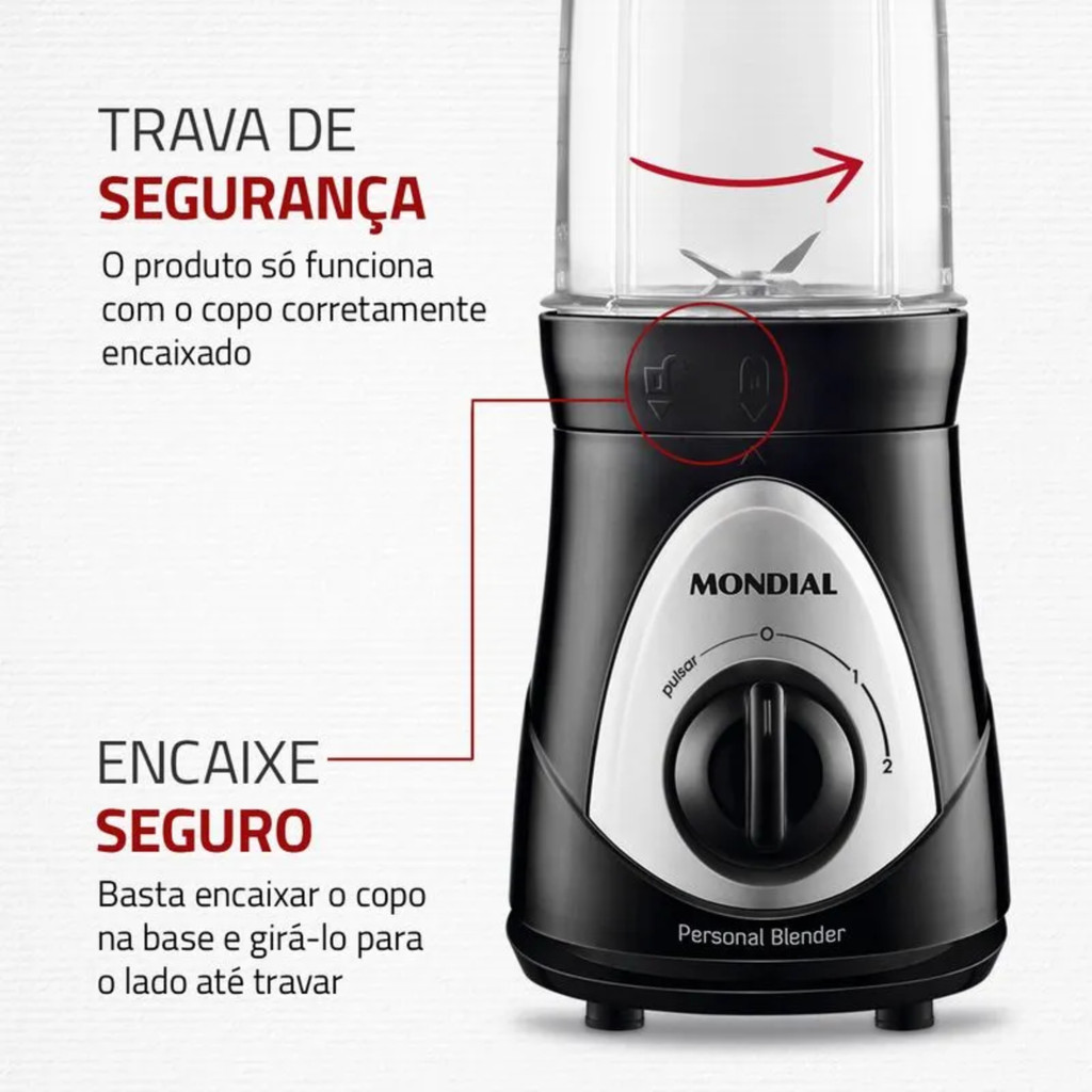 LIQUIDIFICADOR PORTÁTIL MONDIAL PERSONAL BLENDER 300W 127V PRETO DG-01 O Liquidificador Mondial Personal Blender 300W, modelo DG-01 na voltagem 127V e na cor preta, é a solução ideal para quem busca praticidade e versatilidade no preparo de suas bebidas favoritas. Com sua potência de 300W, ele oferece um desempenho excelente para o preparo de sucos, vitaminas, shakes e coquetéis. O kit inclui 2 copos de 750ml cada, que são super-resistentes e podem ser utilizados tanto para preparar suas bebidas quanto como squeezes para transportá-las para a academia, escritório ou qualquer outro lugar. Isso torna sua rotina muito mais prática e conveniente. As lâminas em aço inox são duráveis e resistentes, ideais para triturar frutas e até mesmo cubos de gelo, garantindo um resultado suave e homogêneo em suas bebidas. Além disso, o liquidificador possui um design compacto e é desmontável, facilitando seu armazenamento. Os pés antiderrapantes mantêm o produto estável durante o uso, proporcionando mais segurança. Com o Liquidificador Mondial Personal Blender, você pode manter uma vida saudável com muita praticidade, preparando suas bebidas rapidamente e levando-as consigo para onde quer que vá. Para iniciar o funcionamento do produto, basta girar o copo para desativar a trava de segurança. - Marca: Mondial - Modelo: DG-01 - Trava de segurança: Sim - Voltagem: 127V - Tipo: Blender - Cor: Preto - Capacidade Total: 750ml - Capacidade Útil: 750ml - Potência: 300W - Velocidades: 2 - Material do copo: Copo em San Cristal - Função pulsar: Sim - Função auto-limpeza: Sim - Filtro: Não - Dimensões do produto (LxAxP): 23 x 31,3 x 13,6 cm - Peso do produto: 1,47kg *Imagens meramente ilustrativas Bem vindos A Maxx, tudo em um só lugar.