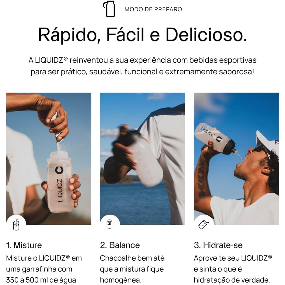 Liquidz o que é? LIQUIDZ é uma solução de hidratação que combina os principais eletrólitos essenciais como sódio, potássio e magnésio. Esses minerais são fundamentais para manter a hidratação adequada, melhorar a função muscular e nervosa, e equilibrar o pH do corpo. Liquidz para que serve? LIQUIDZ é formulado para ser consumido diariamente, especialmente ao acordar, durante e após atividades físicas, para garantir uma hidratação eficiente e rápida. BENEFÍCIOS • Hidratação Rápida e Eficaz • Aumento de Energia e Disposição • Melhora na Recuperação Muscular • Apoio à Função Cognitiva • Alívio de Dores de Cabeça Liquidz como tomar? Basta abrir um stick (sachê) de LIQUIDZ rasgando a embalagem no local indicado e despejar o pó em 325 a 500ml de água (recomendamos água gelada). Se você prefere um sabor mais concentrado e doce, utilize uma quantidade menor de água. INFORMAÇÃO NUTRICIONAL Porção: 5g (1 sachê) Valor energético: 4 kcal (0% VD) Carboidratos: 1 g (0% VD), sendo 0,1 g de açúcares totais e 0 g de açúcares adicionados (0% VD) Sódio: 307 mg (15% VD) Magnésio: 64 mg (15% VD) Potássio: 231 mg (7% VD) •Não contém quantidades significativas de proteínas, gorduras totais, gorduras saturadas, gorduras trans e fibras alimentares. •Percentual de valores diários fornecidos pela porção. Este anúncio você pode escolher entre os sabores de Liquidz na versão Caixa possuindo 14 Sachês