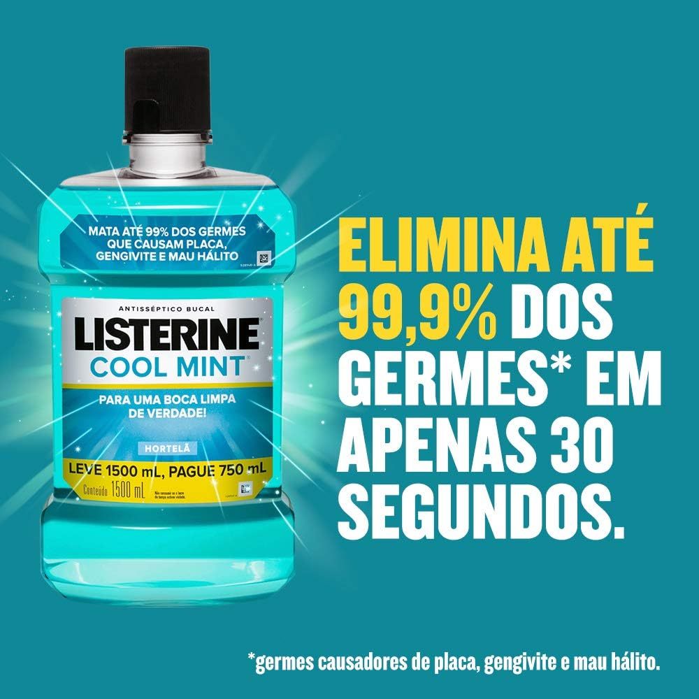 Enxaguante Bucal Listerine Cool Mint Leve 1,5L Pague 750ml O Enxaguante Bucal Listerine Cool Mint Leve 1,5L Pague 750ml combina proteção antisséptica poderosa com um ótimo custo-benefício. Com sabor mentolado intenso, limpa profundamente a boca, combate os germes e proporciona hálito fresco por muito mais tempo. Principais Características: • Fórmula antisséptica que elimina até 99,9% dos germes causadores de mau hálito, placa e gengivite • Sabor Cool Mint refrescante, garantindo sensação duradoura de limpeza • Embalagem promocional leve 1,5L, pague apenas 750ml, ideal para economia no cuidado diário Benefícios: • Ajuda na prevenção de gengivite e acúmulo de placa bacteriana • Proporciona hálito fresco por horas • Atinge áreas da boca que a escova e o fio dental não alcançam • Excelente rendimento com economia Diferenciais do Produto: • Fórmula clinicamente comprovada, com ação profunda e prolongada • Embalagem econômica com o dobro da quantidade pelo mesmo valor • Marca confiável, amplamente recomendada por dentistas Especificações Técnicas: - Peso: 1,5L Instruções de Uso: - Utilize 20ml do produto duas vezes ao dia, após escovar os dentes. - Bocheche por 30 segundos e descarte o líquido. - Não diluir, não ingerir e não enxaguar com água após o uso. Avisos e Precauções: - Não ingerir. Uso externo. - Manter fora do alcance de crianças. - Em caso de irritação, suspender o uso e procurar orientação médica. O que está incluso? - 1 unidade de Enxaguante Bucal Listerine Cool Mint Leve 1,5L Pague 750ml ---- DÚVIDAS FREQUENTES ---- Os produtos são originais? Sim. Todos os nossos produtos são originais. Emitem nota fiscal? Sim. Emitimos nota fiscal para todos os pedidos.