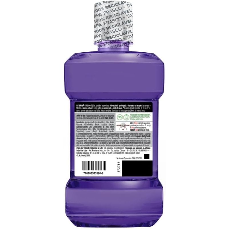 Enxaguante Bucal Listerine Cuidado Total 500ml O Enxaguante Bucal Listerine Cuidado Total 500ml oferece proteção completa para a saúde bucal, atuando contra placas, cáries, gengivite e mau hálito. Sua fórmula potente proporciona uma limpeza profunda e refrescante, ideal para manter a boca saudável no dia a dia. Principais Características: • Fórmula exclusiva com quatro óleos essenciais que combatem germes e bactérias • Proteção contra placa bacteriana, gengivite e cáries • Sabor mentolado que garante frescor intenso e prolongado Benefícios: • Reduz a placa bacteriana e previne o acúmulo de tártaro • Ajuda a manter as gengivas saudáveis • Combate o mau hálito de forma eficaz • Proporciona sensação de limpeza profunda e frescor duradouro Diferenciais do Produto: • Fórmula com combinação de ingredientes que atuam em múltiplos cuidados bucais • Indicado para uso diário, para uma higiene completa • Marca reconhecida e recomendada por profissionais de odontologia Especificações Técnicas: - Peso: 500ml Instruções de Uso: - Utilize 20ml do produto duas vezes ao dia, após escovar os dentes. - Bocheche por 30 segundos e descarte o líquido. - Não diluir, não enxaguar com água após o uso. Avisos e Precauções: - Não ingerir. - Uso externo. - Manter fora do alcance de crianças. - Em caso de irritação, suspender o uso e consultar um profissional de saúde. O que está incluso? - 1 unidade de Enxaguante Bucal Listerine Cuidado Total 500ml ---- DÚVIDAS FREQUENTES ---- Os produtos são originais? Sim. Todos os nossos produtos são originais. Emitem nota fiscal? Sim. Emitimos nota fiscal para todos os pedidos.
