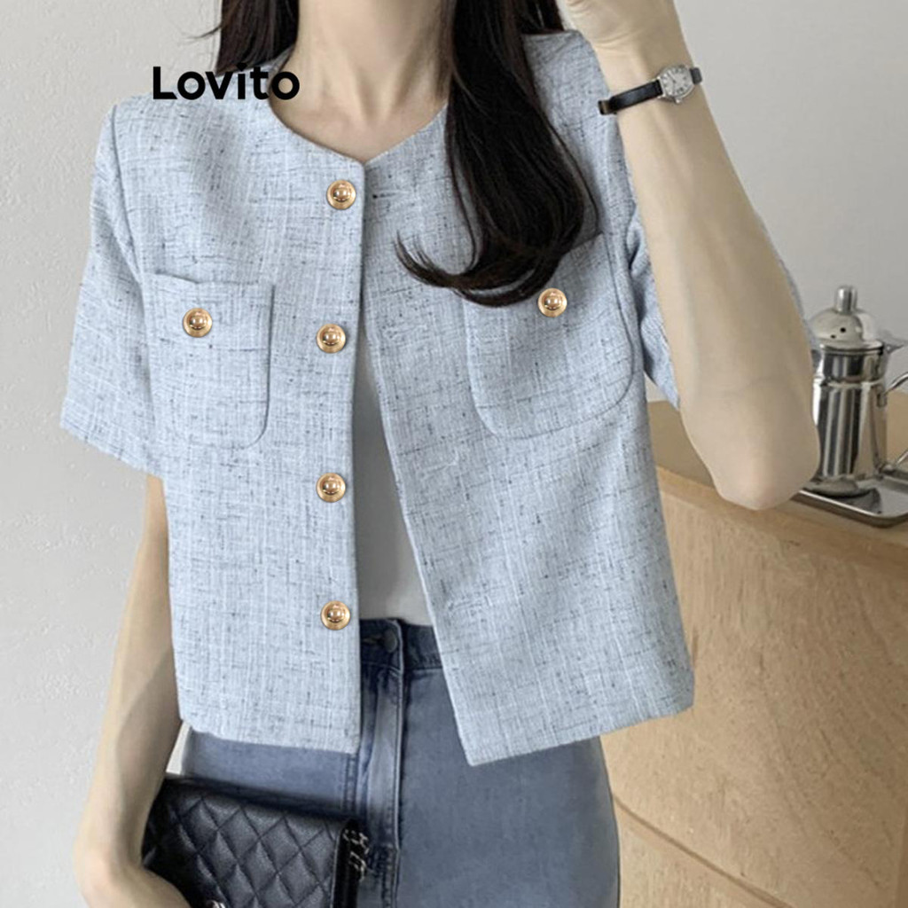 (LIVE STREAM SALE) Lovito Blusa feminina casual com bolso liso e botão de metal LNE62083