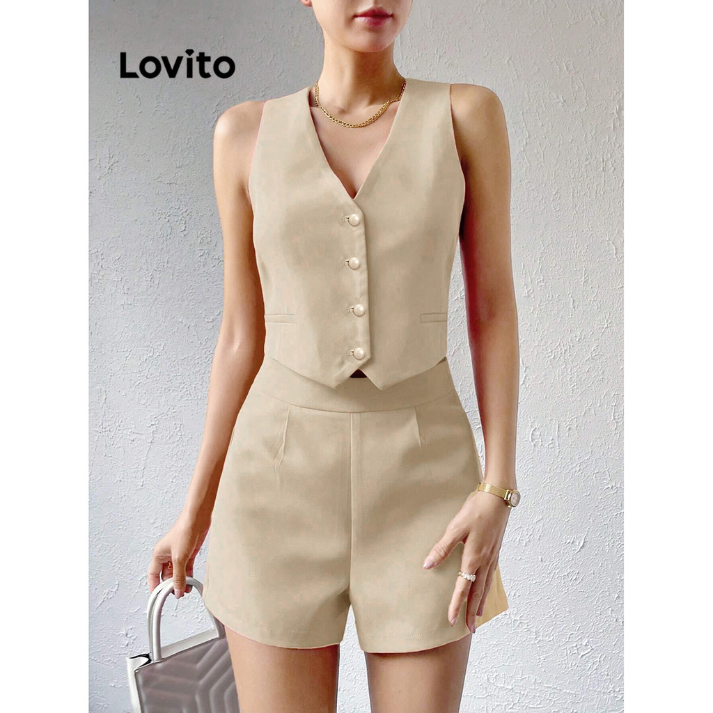 (LIVE STREAM SALE) Lovito Tops ou calças femininas elegantes com botão liso e bolso frontal L74ED069