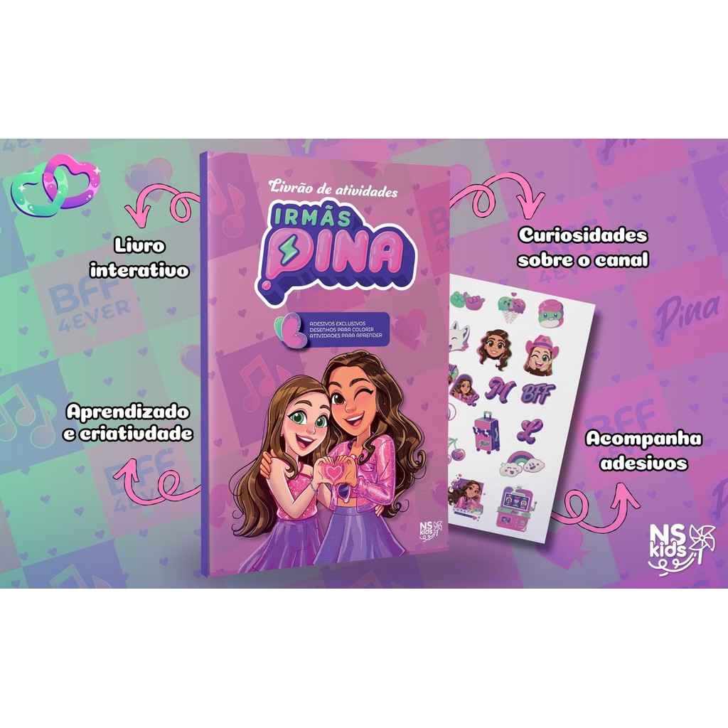 Livrão mais divertido das Irmãs Pina chegou! Prepare-se para entrar no mundo das irmãs mais queridas da internet! Aqui, Manu e Lorena vão te levar para uma jornada cheia de brincadeiras, desafios, curiosidades e atividades que vão testar se você é mesmo um fã de carteirinha. Nesse livrão, as irmãs Pina te levam para um mundo cheio de brincadeiras e desafios, onde você vai descobrir fatos superdivertidos sobre a Manu e a Lorena, enfrentar quizzes e jogos inspirados nos vídeos do canal, procurar e encontrar as irmãs em páginas cheias de detalhes, desembaralhar palavras, contar objetos e ainda colorir soltando toda a sua criatividade! E aí, pronto para entrar nessa aventura? Destaques deste livro • Livro interativo com quizzes, desafios, músicas e atividades para crianças. • Ilustrações coloridas e páginas para colorir. • Conteúdo baseado nos sucessos do canal das Irmãs Pina no YouTube. • Estimula aprendizado e criatividade. • Proporciona entretenimento saudável para toda a família. • Atividades divertidas para aprender e brincar; • Curiosidades sobre o canal; • Acompanha adesivos; Sobre as Irmãs Pina Manu e Lorena são duas criadoras de conteúdo que conquistaram a internet com seus vídeos divertidos, cheios de desaf ios, brincadeiras e muita criatividade. Com um jeitinho carismático e espontâneo, elas transformam o dia a dia em momentos de pura diversão, conquistando milhares de fãs de todas as idades. No canal, risadas e surpresas nunca faltam. 📘 Especificações Editora: Novo Século Data da publicação: 2025 Edição: 1ª Idioma: Português Número de páginas: 64 páginas ISBN: 978-85-428-1917-5 Dimensões: 26 x 17 cm