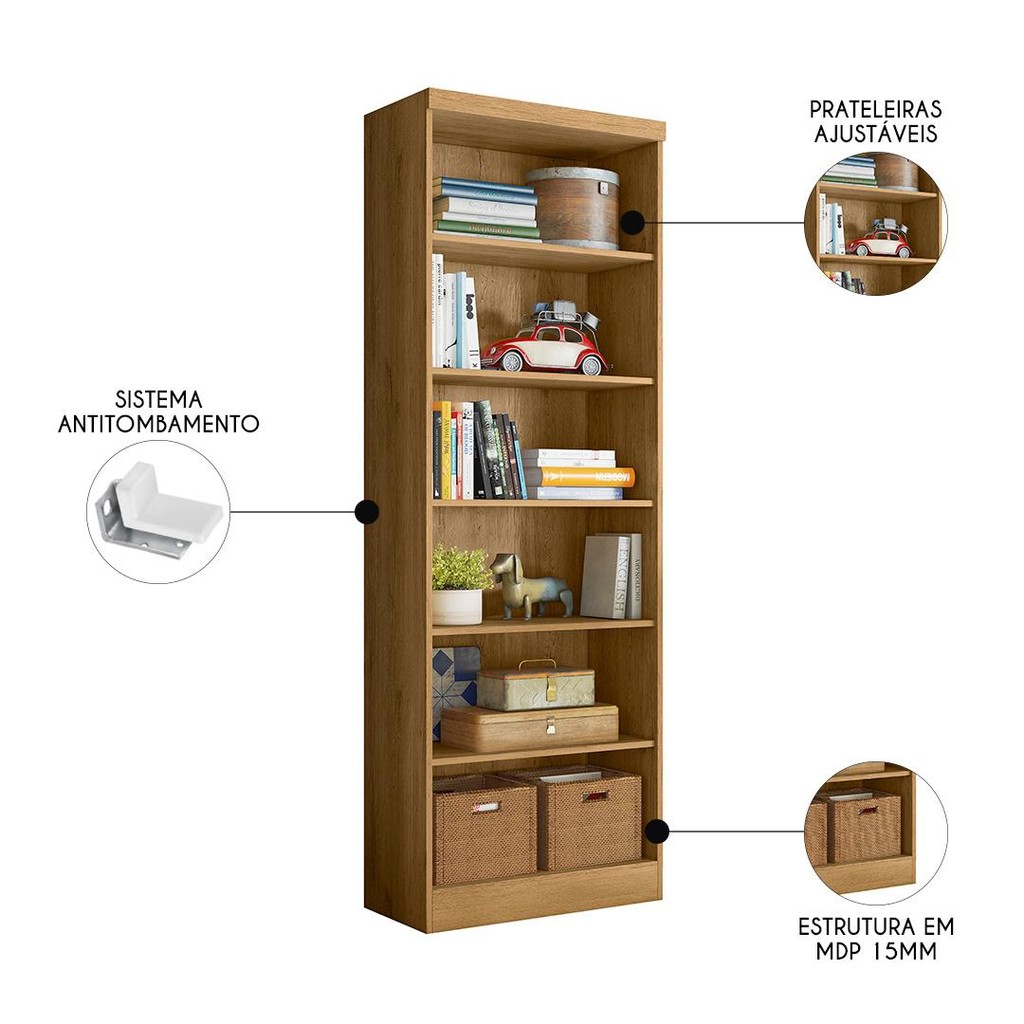 O Livreiro Estante Multiuso Com Prateleiras Linus Freijó da Qmovi é uma peça que combina funcionalidade e design sofisticado. As prateleiras ajustáveis da Estante Livreiro permitem personalizar o espaço de acordo com as necessidades individuais, tornando-o ideal para qualquer configuração de estudo ou leitura. O Livreiro Multiuso conta com integração do sistema antitombamento que reflete o compromisso com a segurança e a estabilidade, essencial em qualquer ambiente doméstico. Além disso, o acabamento em pintura UV não só realça a beleza natural do móvel, mas também oferece uma camada adicional de proteção contra o desgaste diário. Este Livreiro Estante não é apenas um item prático, mas também um elemento que adiciona um toque de elegância e modernidade ao espaço. Adicione o Livreiro Estante ao carrinho e transforme seu espaço com estilo! ESPECIFICAÇÕES Dimensões do Produto Largura: 61 cm. Altura: 183 cm. Profundidade: 35 cm. Peso: 26 kg. Características do Produto Material da Estrutura: MDP 15 mm. Acabamento: Pintura UV. Peso Suportado: 42 kg distribuídos. Escala de Brilho: Brilho/Fosco. Possui Nichos: Não. Possui Prateleiras: Sim. Quantidade de Prateleiras: 5 Prateleiras. Material da Prateleira: MDP. Diferenciais: - Prateleiras ajustáveis. - Design moderno. - Sistema antitombamento. Sistema de Montagem: Cavilhas/Parafusos. Manual de Montagem: Sim. Complexidade da Montagem: Média. Volumes: 1 Volume. Conteúdo da Embalagem: 1 Livreiro. Garantia do Fabricante: 90 dias contra defeito de fabricação. Montagem: Recomendamos que seja feita por um profissional. Recomendação de Limpeza: Utilize pano úmido. Observações importantes - Produto para uso residencial em ambiente interno, não devendo ficar exposto diretamente ao sol, calor e umidades excessivas. - Pode haver alguma diferença de tonalidade entre a imagem e o produto real, por conta do tratamento de imagens e a calibração de cores do seu monitor. - As imagens são meramente ilustrativas, não acompanham objetos de decoração e eletrônicos. - Ao receber a mercadoria, o cliente deve verificar as condições da embalagem, caso haja alguma avaria não assine o comprovante de recebimento. - Montagem, desmontagem e outras instalações serão de responsabilidade do cliente. Não nos responsabilizamos, no ato da entrega, por subir escadas/elevadores ou pelo transporte por guincho em apartamentos. Eventuais despesas são de responsabilidade do comprador. - Confira as dimensões do produto e certifique-se de que passará normalmente por supostos elevadores, portas, escadas e/ou corredores de sua residência.