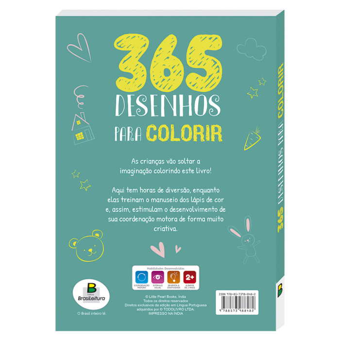 TÍTULO DO LIVRO: 365 Desenhos para colorir (Verde) SINOPSE: As crianças vão soltar a imaginação colorindo este livro! Aqui tem horas de diversão, enquanto elas treinam o manuseio do lápis de cor e, assim, estimulam o desenvolvimento de sua coordenação motora de forma muito criativa. DETALHES DO PRODUTO: Autor: Little Pearl Books EAN: 9788573988482 Coleção: 15,5x22 cm Formato: Brochura Formato: 15,5x22 cm Lançamento: 0 Páginas: 365 Faixa Etária: A partir de 3 anos Acabamento: Brochura com lombada quadrada e glitter Estoque disponível - ENVIO IMEDIATO!!!