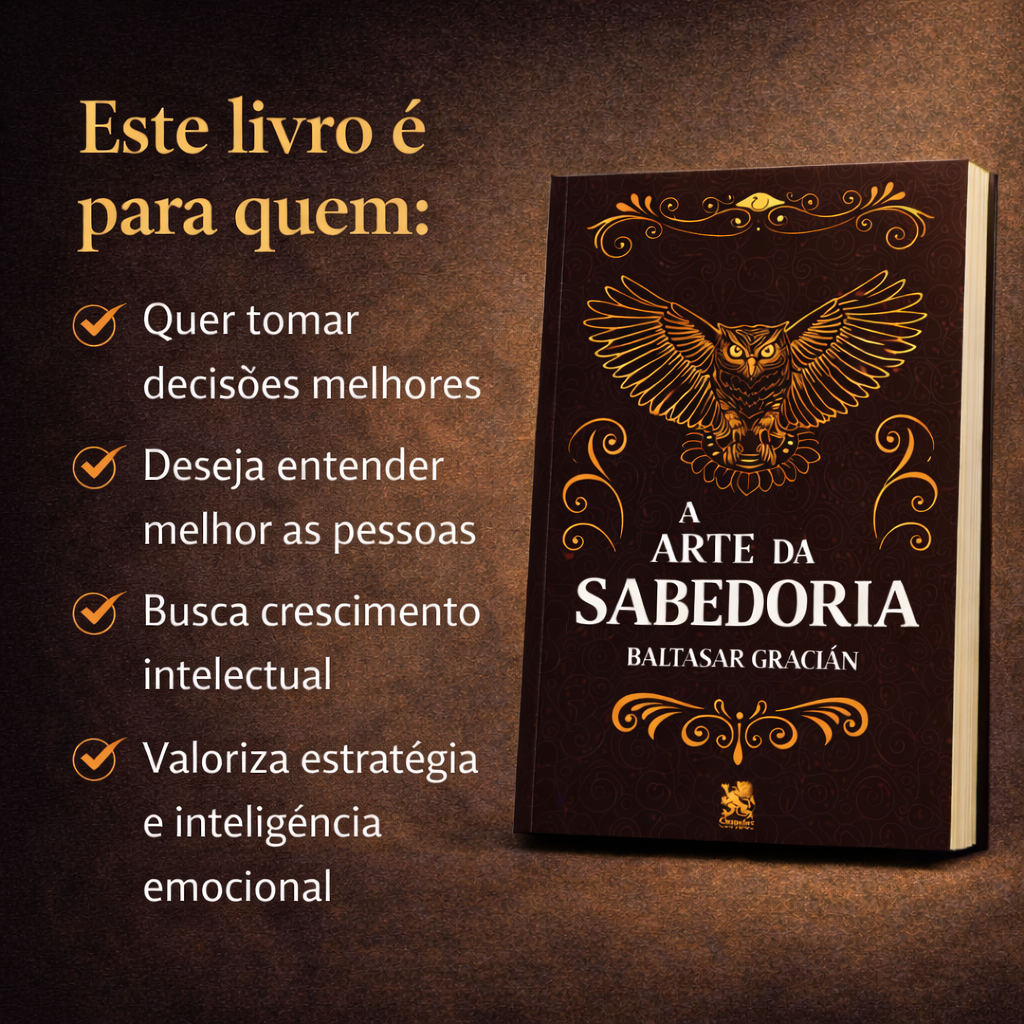 A Arte da Sabedoria – Baltasar Gracián A Arte da Sabedoria é uma obra clássica e atemporal que reúne ensinamentos estratégicos para quem deseja tomar decisões inteligentes, agir com prudência e desenvolver uma mentalidade forte. O que você vai encontrar neste livro: Conselhos práticos para agir com sabedoria Estratégias para lidar melhor com pessoas e situações Desenvolvimento de visão estratégica Reflexões que fortalecem a tomada de decisão Por que ler A Arte da Sabedoria? Ideal para quem deseja pensar antes de agir, evitar erros comuns e desenvolver uma postura mais inteligente diante dos desafios do dia a dia. Um guia de leitura profunda, porém acessível e extremamente relevante até os dias atuais. Informações do Produto: Título: A Arte da Sabedoria Autor: Baltasar Gracián Editora: Camelot Acabamento: Brochura Produto novo e lacrado