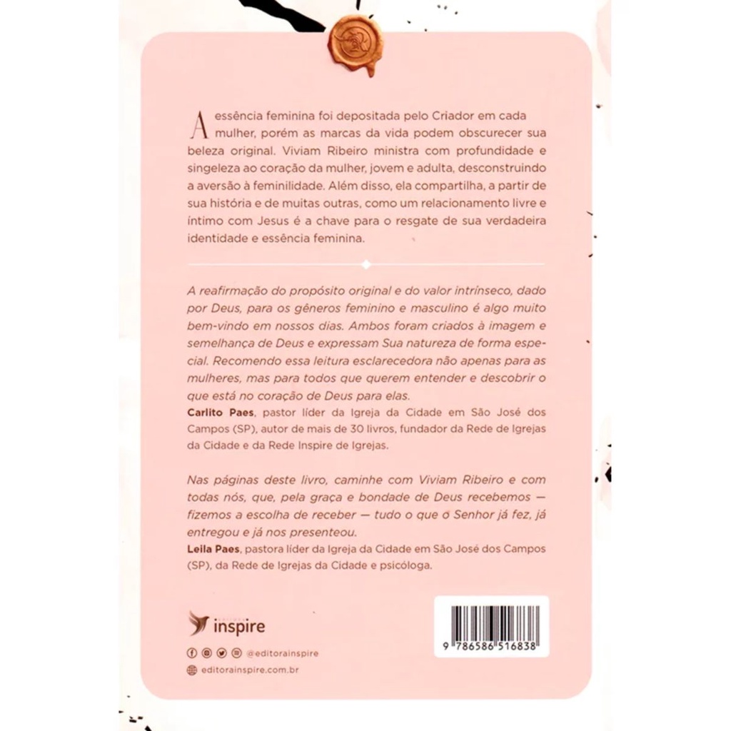 A essência feminina foi depositada pelo Criador em cada mulher, porém as marcas da vida podem obscurecer sua beleza original. Viviam Ribeiro ministra com profundidade e singeleza ao coração da mulher, jovem e adulta, desconstruindo a aversão à feminilidade. Além disso, ela compartilha, a partir de sua história e de muitas outras, como um relacionamento livre e íntimo com Jesus é a chave para o resgate de sua verdadeira identidade e essência feminina. A nova edição é ampliada e revisada. "A reafirmação do propósito original e do valor intrínseco, dado por Deus, para os gêneros feminino e masculino é algo muito bem-vindo em nossos dias. Ambos foram criados à imagem e semelhança de Deus e expressam Sua natureza de forma especial. Recomendo essa leitura esclarecedora não apenas para as mulheres, mas para todos que querem entender e descobrir o que está no coração de Deus para elas." - Carlito Paes Detalhes do Produto: Autor: Viviam Ribeiro Editora: Inspire Acabamento: Brochura Dimensões: 16 larg. X 23 alt. Número de páginas: 224