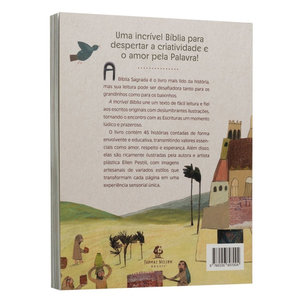 Uma Incrível Bíblia para despertar a criatividade e o amor pela Palavra. A Bíblia Sagrada é o livro mais lido da história, mas sua leitura pode ser desafiadora tanto para os grandinhos como para os baixinhos. A Incrível Bíblia une um texto de fácil leitura e fiel aos escritos originais com deslumbrantes ilustrações, tornando o encontro com as Escrituras um momento lúdico e prazeroso. O livro contém 45 histórias contadas de forma envolvente e educativa, transmitindo valores essenciais como amor, respeito e esperança. Além disso, elas são ricamente ilustradas pela autora e artista plástica Ellen Pestili, com imagens artesanais de variados estilos que transformam cada página em uma experiência sensorial única. Detalhes do Produto: Autor: Ellen Pestili Editora: Thomas Nelson Brasil Acabamento: Brochura Dimensões: 22 larg. X 28 alt. Número de páginas: 304