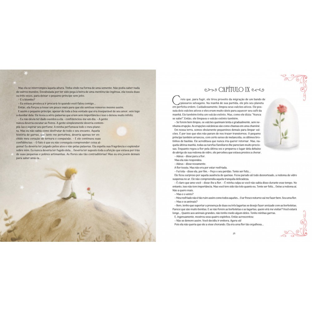 Certa manhã, um aviador que sofreu um acidente no deserto do Saara encontra o pequeno príncipe, uma criança curiosa que vem de outro planeta e que lhe mostrará a importância de ver o mundo com o coração. Um clássico atemporal, acompanhado por ilustrações incrivelmente belas. Editora: Ciranda Cultural Edição: 1, 2025 Autor: Antoine de Saint-Exupéry Ilustrador: Paolo Proietti Idioma: Português Páginas: 96 Dimensões: L 24.00 x A 26.50 x E 1.50 ISBN: 9786526118429 Coleção: Clássicos de ouro Linha Editorial: Ciranda Cultural - Coedição Faixa Etária: + 9 anos Assuntos (tags): Clássicos da literatura , Emoções, Solidão, Autoconhecimento BISAC: Literatura Infantil / Contos Linha de Produto: Almofadado grande Encadernação: Capa dura Acabamento: Laminação fosca e verniz localizado Material: Papel