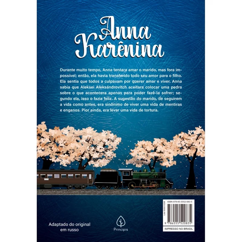 TÍTULO DO LIVRO: Anna Karênina SINOPSE: Anna Karerina é uma mulher inteligente e bela da aristocracia da Rússia czarista que permeia círculos importantes de São Petersburgo, onde seu marido é um respeitado servidor público. O casamento de seu irmão entra em crise quando uma traição vem à tona e Anna intercede para que essa instituição não vá a falência, porém se questiona a respeito de sua própria felicidade e matrimônio quando uma paixão ameaça surgir. Crises familiares entre bailes da nobreza ilustram a alta sociedade russa neste romance clássico. DETALHES DO PRODUTO: Editora: Principis Edição: 1, 2020 Autor: Liev Tolstói Idioma: Português Páginas: 368 Dimensões: L 15.50 x A 22.60 x E 2.00 ISBN: 9786555520835 Coleção: Clássicos da literatura mundial Linha Editorial: Principis - Clássicos da literatura Faixa Etária: + 14 anos Assuntos (tags): Romance, Histórias, Trama, Literatura Russa, Paixão, Traição, Felicidade, Casamento, Séries e filmes, Rússia BISAC: Ficção / Romance (História de Amor) Linha de Produto: Principis Encadernação: Brochura Acabamento: Laminação brilho Material: Papel Estoque disponível - ENVIO IMEDIATO!!!