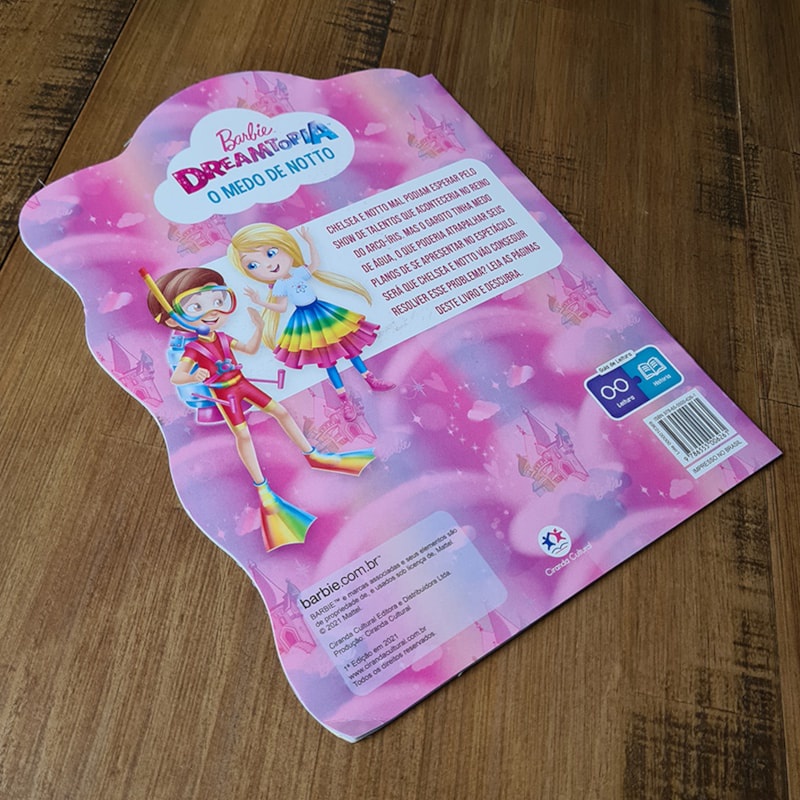 Livro Barbie Dreamtopia O Medo de Notto. Chelsea e Notto mal podiam esperar pelo show de talentos que aconteceria no Reino do Arco-íris. Mas o garoto tinha medo de água, o que poderia atrapalhar seus planos de se apresentar no espetáculo. Será que Chelsea e Notto vão conseguir resolver esse problema? Leia as páginas deste livro e descubra. Especificações do livro Barbie Dreamtopia Título: Barbie Dreamtopia Subtítulo: O Medo de Notto Ano de Edição: 2021 Capa: Brochura Acabamento: Laminação Brilhante Miolo: Papel Offset Páginas: 16 Dimensões: Altura: 27,5 cm Largura: 21 cm Peso: 0,060 kg ISBN: 9786555006261 Editora: Ciranda Cultural