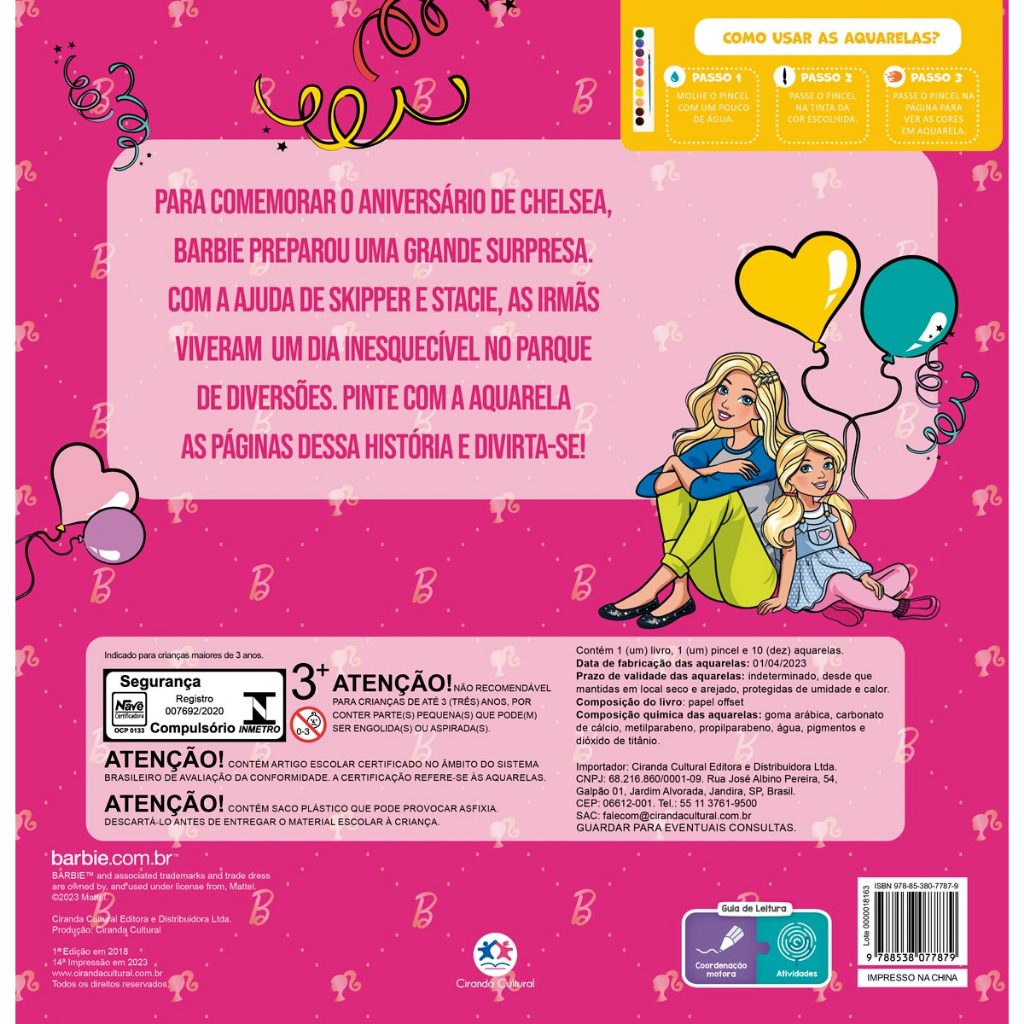 Para comemorar o aniversário de Chelsea, Barbie preparou uma grande surpresa. Com a ajuda de Skipper e Stacie, as irmãs viveram um dia inesquecível no parque de diversões. Pinte com a aquarela as páginas dessa história e divirta-se! Editora: Ciranda Cultural Edição: 1, 2018 Autor: Ciranda Cultural Idioma: Português Páginas: 16 Dimensões: L 27.00 x A 28.00 x E 0.10 ISBN: 9788538077879