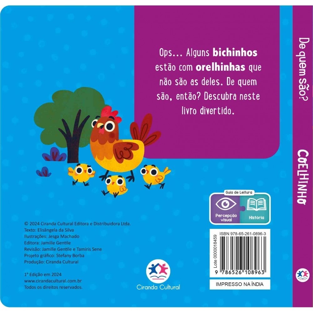 Ops... Alguns bichinhos estão com orelhinhas que não são as deles. De quem são, então? Descubra neste livro divertido. Editora: Ciranda Cultural Edição: 1, 2024 Autor: Elisângela da Silva Ilustrador: Jesga Machado Idioma: Português Páginas: 8 Dimensões: L 14.50 x A 15.00 x E 0.86 ISBN: 9786526108963 Coleção: De quem são? Linha Editorial: Ciranda Cultural - Ficção infantil Faixa Etária: + 4 anos Assuntos (tags): Descoberta, Diversão, Animais, 4 anos BISAC: Literatura Infantil / Animais Linha de Produto: Cartonado com pelúcia Encadernação: Lombada quadrada Acabamento: Laminação fosca Material: Cartonado