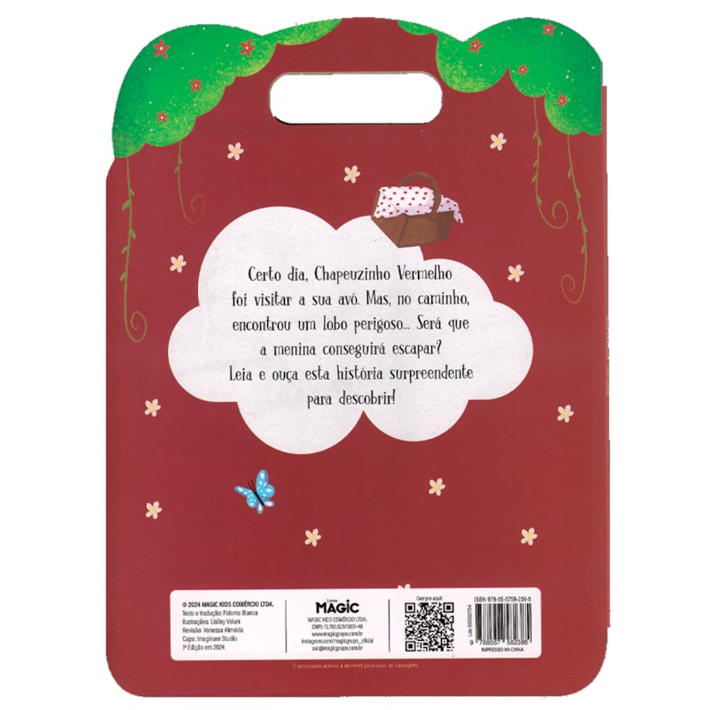 Livro Chapeuzinho Vermelho | QR Codes de Narrações em Inglês e Português QR Codes de Narrações em Inglês e Português Chapeuzinho Vermelho é uma história clássica e encantadora, que une diversão e aprendizado. Com ilustrações vibrantes e formato cartonado com alça, o livro é perfeito para as mãozinhas das crianças. A edição bilíngue (Português e Inglês) e o QR Code com narração em ambos os idiomas proporcionam uma experiência interativa e imersiva, ideal para estimular a imaginação e o aprendizado de forma lúdica. Parte da coleção Cartonado com Alça da Magic Kids, é uma ótima opção para leituras compartilhadas entre pais e filhos, incentivando o amor pela leitura desde cedo. Destaques: Leitura bilíngue: Português e Inglês. Narração interativa: QR Code com áudio nos dois idiomas . Aprendizado divertido: Histórias que estimulam a imaginação e o desenvolvimento linguístico.