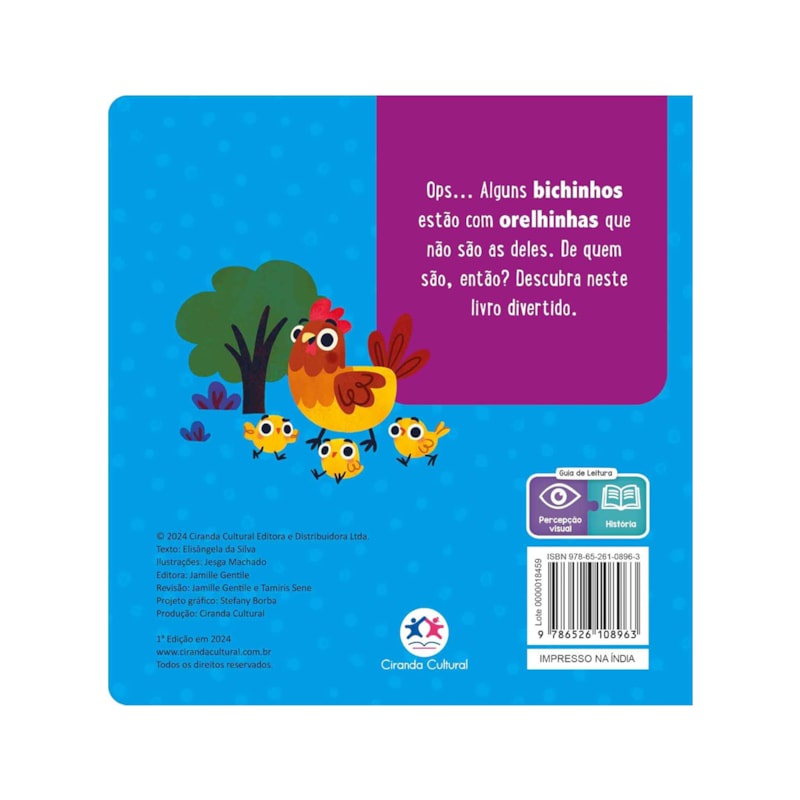 Livro Coelhinho | De Quem São? Oops... Alguns animais estão com orelhas que não são as suas! Mas de quem serão essas orelhinhas? Venha se divertir e descobrir neste livro encantador! Especificações do livro Coelhinho | De Quem São?: Título: Coelhinho | De Quem São? Ano de Edição: 2024 Capa: Capa Dura Acabamento: Laminação Fosca Miolo: Papel Cartonado Páginas: 8 Dimensões: 14,5 x 18 x 1 cm Peso: 0.170 kg ISBN: 9786526108963 Editora: Ciranda Cultural