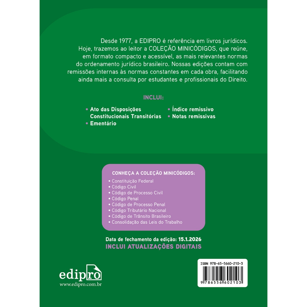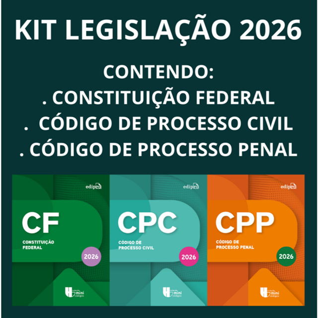 ⚖️🔍 Kit Processos + Constitucional 2026 – CONSTITUIÇÃO + CÓDIGO DE PROCESSO CIVIL + CÓDIGO DE PROCESSO PENAL O Kit Processo + Constitucional 2026 da Editora EDIPRO reúne três dos principais diplomas legais do ordenamento jurídico brasileiro, indispensáveis para estudantes de Direito, concurseiros, advogados, estagiários e servidores públicos. Com edições atualizadas, compactas e de consulta rápida, este kit é ideal para quem precisa dominar fundamentos constitucionais e regras processuais, tanto na teoria quanto na prática. 🔹 Constituição Federal 2026 _ Texto constitucional atualizado _ Ato das Disposições Constitucionais Transitórias (ADCT) _ Ementário _ Índice remissivo _ Notas remissivas _ Remissões internas entre normas _ Atualizações digitais incluídas 📅 Data de fechamento da edição: 15/01/2026 🔹 Código de Processo Penal 2026 _ Lei de Introdução ao Código de Processo Penal _ Lei de Execução Penal _ Súmulas e Súmulas Vinculantes do STF _ Temas com Repercussão Geral do STF _ Súmulas do STJ _ Índice remissivo _ Notas remissivas _Atualizações digitais incluídas 📅 Data de fechamento da edição: 09/01/2026 🔹 Código de Processo Civil 2026 _ Lei de Introdução às Normas do Direito Brasileiro (LINDB) _ Enunciados do FPPC, ENFAM, CJF e STJ _ Súmulas e Súmulas Vinculantes do STF _ Temas com Repercussão Geral do STF _ Súmulas do STJ _ Índice remissivo _ Notas remissivas _ Atualizações digitais incluídas 📅 Data de fechamento da edição: 07/01/2026 🎯 POR QUE COMPRAR ESTE KIT? ✔ Reúne Constituição + Processo Civil + Processo Penal em um único kit ✔ Essencial para concursos públicos, OAB e prática jurídica ✔ Ideal para estudo sistemático e consulta rápida ✔ Formato compacto: fácil de transportar e usar no dia a dia ✔ Editora EDIPRO: referência em livros jurídicos desde 1977 ✔ Excelente custo-benefício em comparação à compra individual 👥 INDICADO PARA: _ Estudantes de Direito _ Concurseiros (Tribunais, Ministério Público, Defensoria, Polícia) _ Advogados e estagiários _ Servidores públicos _ Professores e pesquisadores Título: KIT JURÍDICO 2026 – COLEÇÃO MINICÓDIGOS EDIPRO - Código Penal 2026 + Código de Processo Penal 2026 Edição: 3ª edição, 2026 Supervisão editorial: Jair Lot Vieira Editora: Edipro Assunto: Legislação Palavras-chave: Constituição Federal 2026, Código de Processo Civil 2026, Código de Processo Penal 2026, Kit Direito Processual, Minicódigos Edipro, Códigos Atualizados 2026, Concurso Público, OAB, Direito Constitucional, Processo Civil, Processo Penal. Altura: 15,5 cm Largura: 11,5 cm Espessura: 10 cm Número de páginas: 1040 Peso: 1000 g Idioma: Português Acabamento: Brochura