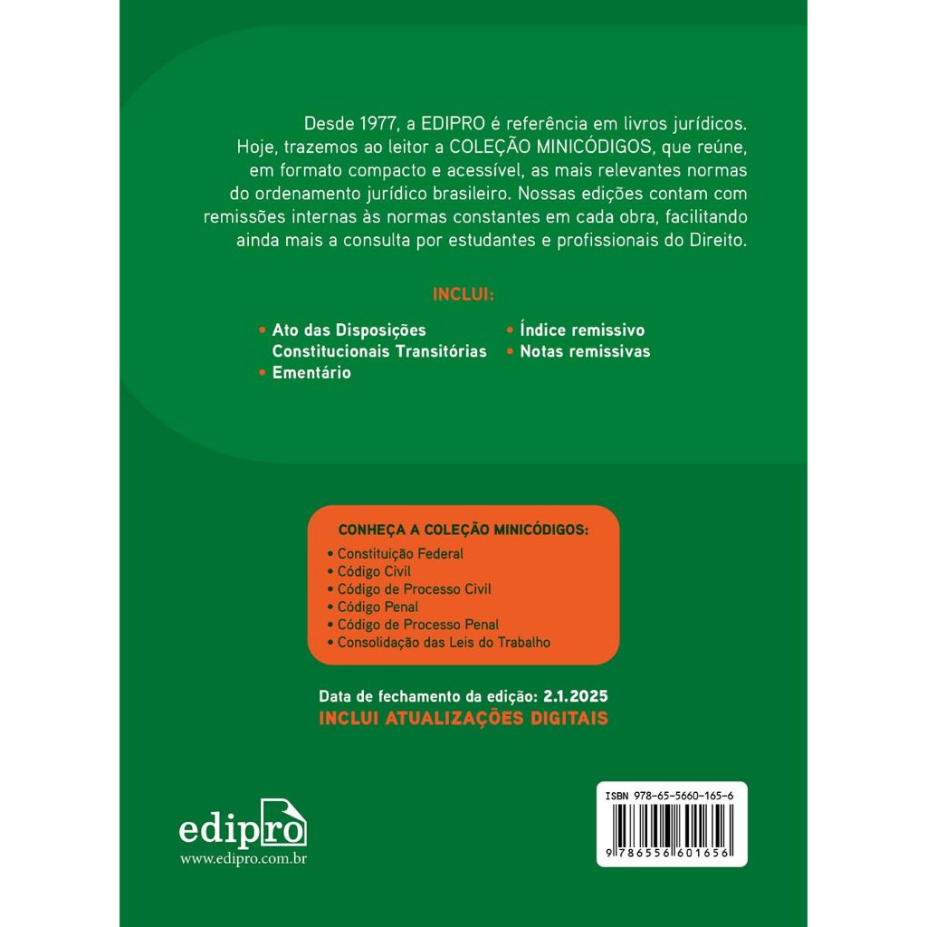 Desde 1977, a EDIPRO é referência em livros jurídicos. Hoje, trazemos ao leitor a COLEÇÃO MINICÓDIGOS, que reúne, em formato compacto e acessível, as mais relevantes normas do ordenamento jurídico brasileiro. Nossas edições contam com remissões internas às normas constantes em cada obra, facilitando ainda mais a consulta por estudantes e profissionais do Direito. INCLUI: Ato das Disposições Constitucionais Transitórias; Ementário; Índice remissivo; Notas remissivas. INCLUI ATUALIZAÇÕES DIGITAIS DATA DE FECHAMENTO DA EDIÇÃO: 15.1.2026