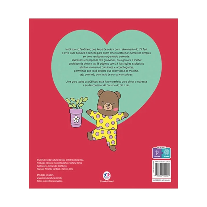 Livro Cute Buddies | Livro de Colorir Inspirado no fenômeno dos livros de colorir para relaxamento no TikTok, o livro Cute Buddies é a escolha ideal para quem adora transformar momentos simples em experiências de pura tranquilidade. Com 48 páginas de ilustrações exclusivas impressas em papel de alta gramatura, o livro garante a melhor qualidade para sua pintura, seja com lápis de cor ou marcadores. Cada página traz cenas acolhedoras do cotidiano, convidando você a explorar sua criatividade enquanto relaxa. Perfeito para todas as idades, Cute Buddies oferece uma maneira divertida e eficaz de aliviar o estresse e se desconectar da agitação diária. Especificações do livro Biblical and Cute | Livro Para Colorir | Violeta: Título: Cute Buddies | Livro de Colorir Ano de Edição: 2025 Capa: Capa Brochura Acabamento: Laminação Fosca com Verniz Localizado Miolo: Papel Offset Páginas: 48 Dimensões: 24 x 0,5 x 24 cm Peso: 0.237 kg ISBN: 9786526122501 Editora: Ciranda Cultural