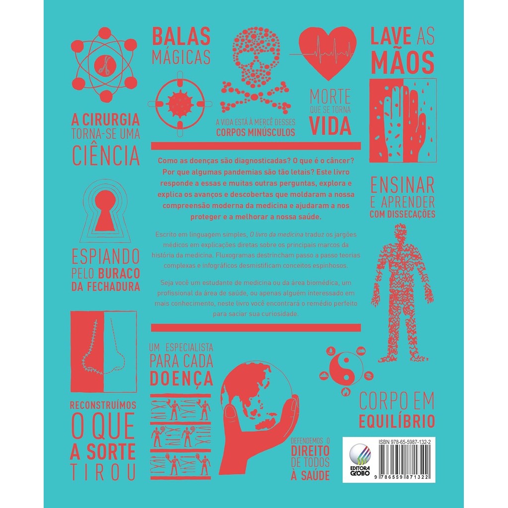 Como as doenças são diagnosticadas? O que é o câncer? Por que algumas pandemias são tão letais?Escrito em linguagem simples e acessível, O livro da medicina traz a história da medicina, desde os primórdios da prática médica na China, até os princípios que nortearam a atuação dos médicos nos dias de hoje. A obra faz parte da coleção best-seller As grandes ideias de todos os tempos, que tem mais de 20 títulos publicados pela Globo Livros sobre assuntos diversos como direito, biologia, psicologia, química, história, ecologia, entre tantos outros.Repleto de infográficos e ilustrações, O livro da medicina traduz jargões médicos e explora os principais marcos e avanços tecnológicos da medicina, com destaque para o combate a pandemias, vacinação, cirurgias, transfusões de sangue e transplantes de órgãos. A obra também fala sobre xamanismo, medicina oriental, farmacologia, anatomia, além de abordar os cuidados com a saúde mental.