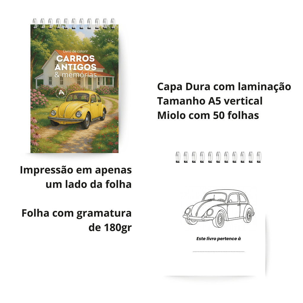 LIVRO DE COLORIR CARROS ANTIGOS – ARTE & MEMÓRIAS O Livro de Colorir Carros Antigos – Artêra leva você a uma viagem no tempo com modelos icônicos que marcaram gerações. Cada página foi criada para oferecer uma experiência de colorir agradável, relaxante e envolvente — ideal para crianças, adultos, colecionadores e apaixonados pelo universo automotivo vintage. Com formato A5 vertical, capa dura e wire-o superior, o livro é prático e confortável de usar. As páginas em papel offset 180 g/m² garantem ótimo desempenho com lápis de cor, canetinhas ou marcadores. Acompanha folha de acetato reposicionável, perfeita para evitar transferência de tinta entre as páginas. Mais que um livro, é uma experiência criativa que estimula atenção, coordenação e bem-estar enquanto você colore carros clássicos que fizeram história. DESTAQUES DO PRODUTO: 47 desenhos exclusivos de carros antigos – 01 por página, na vertical. Capa dura 15x21 cm (A5) com acabamento laminado e design elegante. Papel offset 180 g/m², ideal para lápis de cor, canetinhas, marcadores e giz de cera. Folha de acetato protetora reposicionável, evitando manchas durante a pintura. Encadernação wire-o superior, que facilita o uso, deixa o livro mais prático e melhora a experiência de colorir. INDICADO PARA: Adultos e crianças que adoram carros clássicos; Colecionadores e fãs do universo automotivo vintage; Quem busca uma atividade relaxante, criativa e inspiradora; Presentear alguém especial que ama carros antigos. DÚVIDAS FREQUENTES: 1 – Quais materiais posso usar para colorir? Você pode usar lápis de cor, giz de cera, canetinhas hidrográficas e marcadores. O papel 180 g/m², aliado ao acetato protetor, ajuda a evitar que a tinta passe para o outro lado. 2 – Qual o tamanho do livro? Capa: 15 x 21 cm (A5 vertical) Páginas internas: 15 x 21 cm (A5) na vertical 3 – Para quem é indicado este livro? Para todas as idades! Ideal para quem gosta de carros antigos, aprecia arte para colorir e deseja uma atividade criativa e relaxante. 4 – É uma boa opção para presente? Com certeza! É um presente criativo, temático e especial para apaixonados por carros clássicos e colecionadores. Observação: As cores da capa podem apresentar pequenas variações devido às características de impressão. Ainda tem dúvidas? Utilize o campo de perguntas — teremos prazer em ajudar!