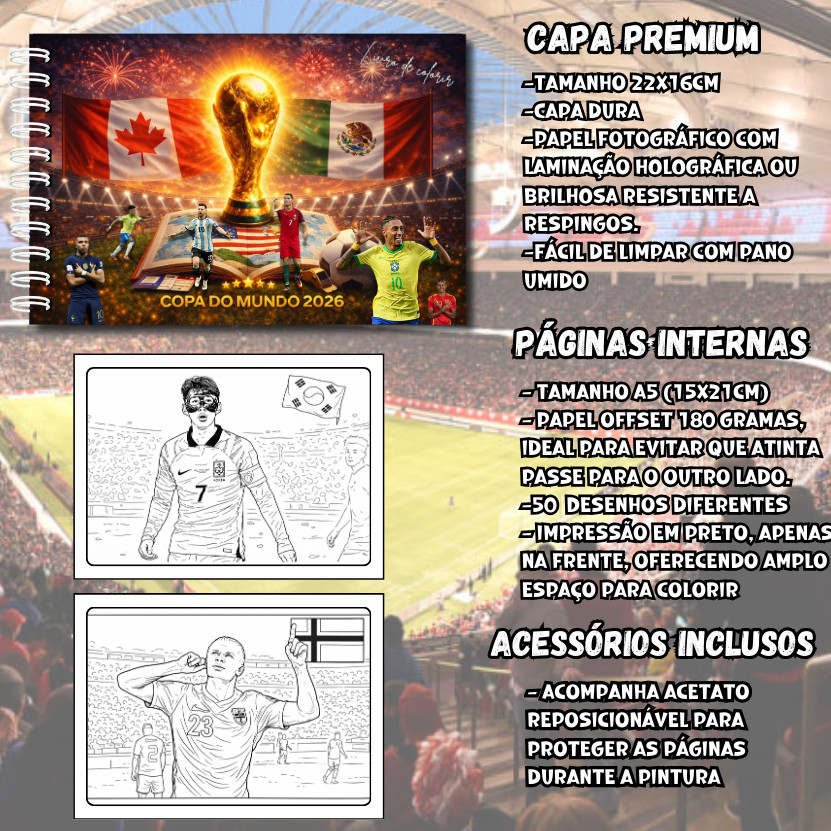 Livro De Colorir Copa Do Mundo 2026 Futebol Capa Dura 50 Páginas 180g A5 + Acetato