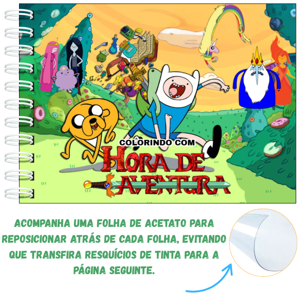 Livro de Colorir Inspirado na Série Hora de Aventura Capa Dura A5 50 Paginas Holográfico + Acetato