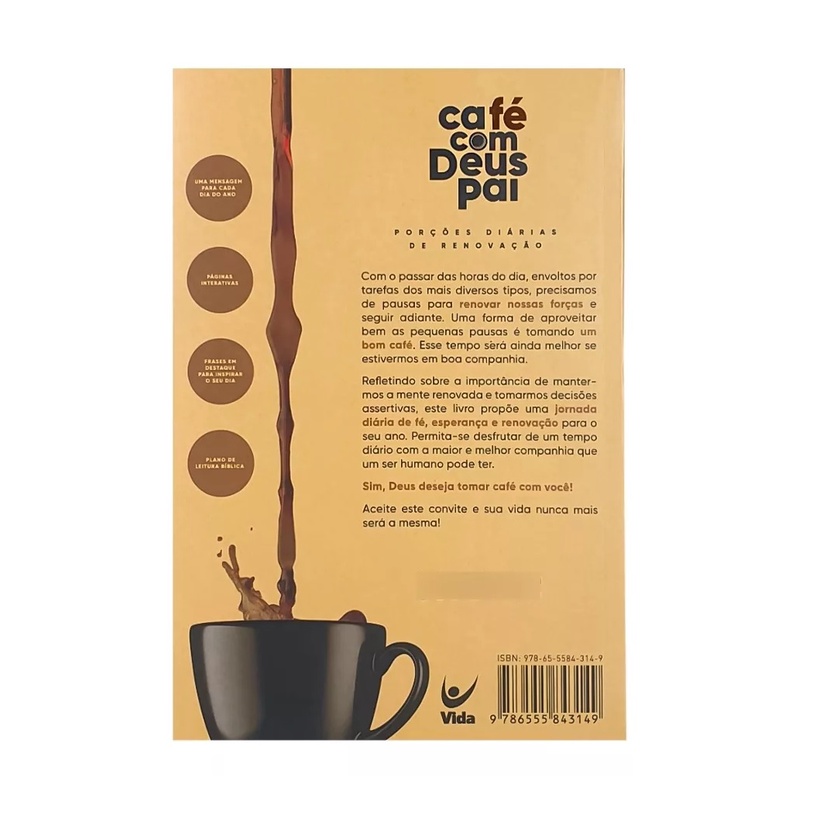 Kit Devocional | Café com Deus Pai + Kids Um incrível Box com o devocional mais lido do Brasil do autor Best-seller Junior Rostirola, um Kit especial para adultos e crianças, homens e mulheres, todos os livros publicados pela Editora Vida. 1- Devocional Café com Deus Pai | Junior Rostirola - 424 páginas; Formato - 16 larg. X 23 alt. Porções de fé, esperança e renovação pra fortalecer a sua vida diariamente. O Devocional Café com Deus Pai vai te proporcionar: Mensagens inspiradoras todos os dias do ano de Janeiro a Dezembro; Páginas coloridas com interação; Frases em destaque para inspirar o seu dia; Plano de Leitura Bíblica; Espaços para anotações de sonhos e projetos; Porções diárias de renovação baseadas na Palavra de Deus; Tome seu café da manhã todos os dias e desfrute da gloriosa presença de Deus; sim o Pai deseja tomar café com você! Uma jornada diária de Fé. esperança e renovação, meditações que vão transformar o seu dia, na melhor companhia que um ser humano pode ter. 2- Café com Deus Pai Kids | Junior Rostirola - 132 páginas; Formato - 15 larg. X 15 alt. Um livro encantador para as crianças, com mensagens bíblicas sobre o Amor de Deus. Café com Deus Pai Kids do autor Junior Rostirola é um livro especial, apresentando 6 estudos bíblicos para os pequenos de uma maneira maravilhosa, é indicado para crianças a partir de 5 anos, vem com ilustrações muito bem elaboradas e coloridas, atividades divertidas que resultam em um maior interesse pela Palavra de Deus, e para conhecer Jesus Cristo o filho de Deus. O livro infantil pode ser usado como Devocional ensinando aos pequenos a falar com Deus todos os dias, traz ensinos importantes sobre a Bíblia e a vida cristã, uma maneira excelente de apresentar Cristo à eles, com mensagens que irão tocar seus corações trazendo princípios importantes de caráter cristão. Sobre o Autor: Junior Rostirola é casado com Michelle e pai de João Pedro e Isabella. Pastor Sênior da Igreja Reviver com sede na cidade de Itajaí - SC, lidera uma comunidade cristã socialmente relevante, com extensão no Haiti. Bacharel em Teologia e pós-graduado em Teologia Bíblica. Ele que foi órfão de pai vivo, hoje é carinhosamente chamado de pai para muitos, através do seu chamado na área de paternidade, se tornou referencial e fundador da Associação Escolhi Amar, que abrange diversos projetos sociais.