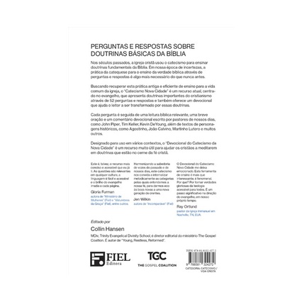 Nos séculos passados, a igreja cristã usou o catecismo para ensinar doutrinas fundamentais da Bíblia. Em nossa época de incertezas, a prática da catequese para o ensino da verdade bíblica através de perguntas e respostas é algo mais necessário do que nunca antes. Buscando recuperar esta prática antiga e eficiente de ensino para a vida comum da igreja, o “Catecismo Nova Cidade” é um recurso atual, centrado no evangelho, que apresenta doutrinas importantes do cristianismo através de 52 perguntas e respostas e também oferece um devocional que ajuda o leitor a ser transformado por essas doutrinas. Cada pergunta é seguida de uma leitura bíblica relevante, uma breve oração e um comentário devocional escrito por pastores de nossos dias, como John Piper, Tim Keller, Kevin DeYoung, além de textos de personagens históricos, como Agostinho, João Calvino, Martinho Lutero e muitos outros. Designado para uso em vários contextos, o “Devocional do Catecismo da Nova Cidade” é um recurso muito útil para ajudar os cristãos a meditarem em doutrinas que estão no cerne da fé cristã. Páginas:240