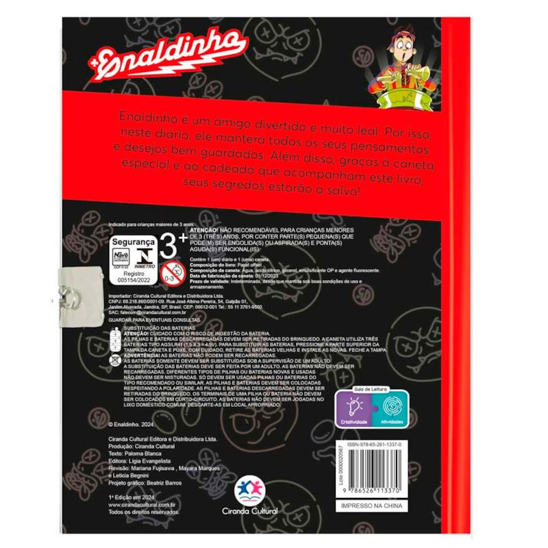 Livro Enaldinho | Meu Diario Secreto | C/ Caneta Mágica Enaldinho é o melhor amigo que alguém poderia ter: divertido, leal e cheio de histórias incríveis para contar! Neste diário especial, ele vai guardar todos os seus pensamentos, sonhos e segredos mais profundos. Enaldinho é um amigo divertido e leal, perfeito para guardar seus segredos! Este diário inclui: 1 cadeado com chave para segurança 1 caneta especial de escrita suave Páginas resistentes para anotações diárias Com ele, seus pensamentos e desejos estarão protegidos – e a diversão, garantida!" Especificações do livro Enaldinho | Meu Diario Secreto | C/ Caneta Mágica: Título: Enaldinho | Meu Diario Secreto | C/ Caneta Mágica Ano de Edição: 2024 Capa: Dura Acabamento: Laminação Fosca Miolo: Papel Offset Páginas: 96 Dimensões: Altura: 20 cm Largura: 15,5 cm Profundidade: 2,5 cm Peso: 0,230 kg ISBN: 9786526113370 Editora: Ciranda Cultural