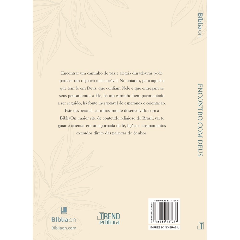 Encontrar um caminho de paz e alegria duradouras pode parecer um objetivo inalcançável. No entanto, para aqueles que têm fé em Deus, que confiam Nele e que entregam os seus pensamentos a Ele, há um caminho bem pavimentado a ser seguido, há fonte inesgotável de esperança e orientação. Este devocional, carinhosamente desenvolvido em parceria com a BibliaOn, maior site de conteúdo cristão do Brasil, vai te guiar e orientar em uma jornada de fé, lições e ensinamentos extraídos direto das palavras do Senhor. Editora: Trend Edição: 1, 2024 Autor: BíbliaOn Idioma: Português Páginas: 384 Dimensões: L 15.50 x A 22.60 x E 1.80 ISBN: 9786583187277 Coleção: Não se aplica Linha Editorial: Trend Faixa Etária: + 18 anos Assuntos (tags): Devocional, Deus, Religião, Motivação, Cristianismo BISAC: Religião / Devocional Linha de Produto: Trend Encadernação: Brochura Acabamento: Pantone Material: Papel