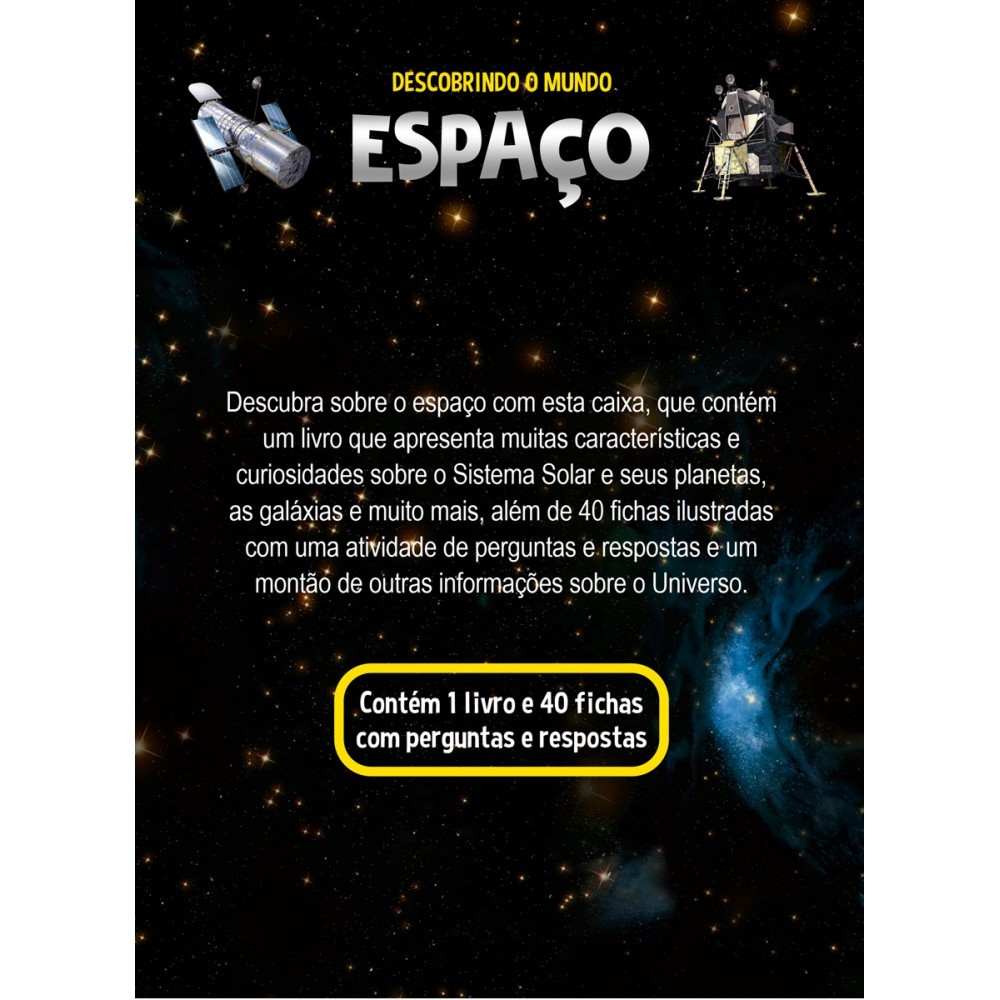 Descubra mais sobre o espaço com esta caixa, que contém um livro que apresenta muitas características e curiosidades sobre o Sistema Solar e seus planetas, as galáxias e muito mais, além de 40 fichas ilustradas com uma atividade de perguntas e respostas e um montão de outras informações sobre o Universo. Editora: Ciranda Cultural Edição: 1, 2024 Autor: Paco Torrubiano Ilustrador: Toni Rodríguez Idioma: Português Páginas: 48 Dimensões: L 13.70 x A 19.00 x E 6.00 ISBN: 9786526115176 Coleção: Descobrindo o mundo Linha Editorial: Ciranda Cultural - Coedição Faixa Etária: + 4 anos Assuntos (tags): Descoberta, Espaço, Perguntas, Respostas, Curiosidade BISAC: Não Ficção Infantil / Ciência & Natureza / Astronomia Linha de Produto: Caixa cards, Box presente Encadernação: Lombada quadrada Acabamento: Laminação fosca e verniz localizado Material: Cartonado