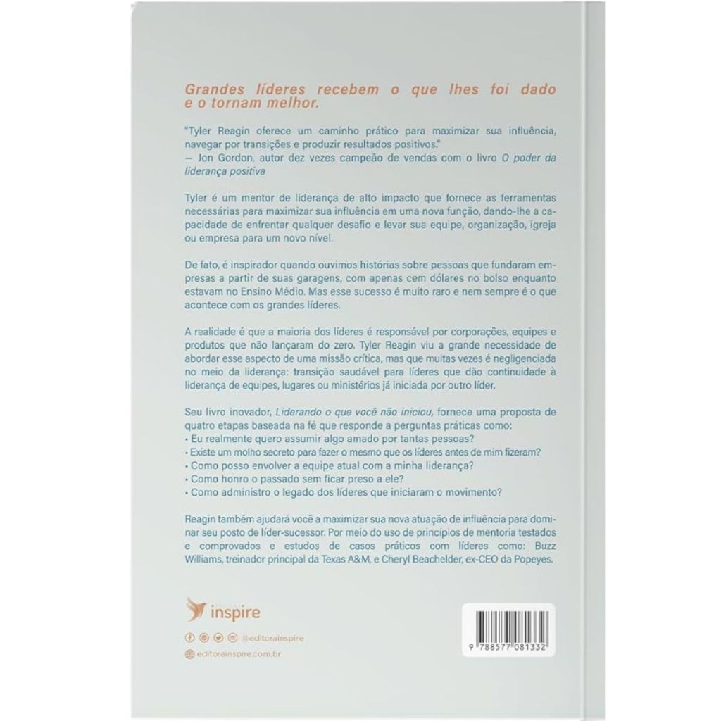 Um livro sobre transição saudável para líderes que darão continuidade a liderança de equipes, lugares ou ministérios já iniciada por outro líder. Escrito com autoridade por Tyler Reagin.A realidade é que a maioria dos líderes é responsável por corporações, equipes e produtos que não lançaram do zero. Tyler Reagin viu a grande necessidade de abordar esse aspecto de uma missão crítica, mas que muitas vezes é negligenciada no meio da liderança: transição saudável para líderes que dãro continuidade a liderança de equipes, lugares ou ministérios já iniciada por outro líder. O livro fornece uma proposta de quatro etapas baseada na fé que responde a perguntas como: "Eu realmente quero assumir algo amado por tantas pessoas?" ; "Existe um molho secreto para fazer o mesmo que os líderes antes de mim fizeram"; "Como posso envolver a equipe atual com a minha liderança?"; "Como honro o passado sem ficar preso a ele?"; " Como administro o legado dos líderes que iniciaram o movimento?". Por meio do uso de principios de mentoria testados e comprovados e estudos de casos práticos com líderes como: Buzz Williams, treinador da Texas A&M, e Cheryl Beachelder, ex-CEO da Popeyes. Detalhes do Produto: Autor: Tyler Reagin Editora: Inspire Acabamento: Brochura Dimensões: 14 larg. X 21 alt. Número de páginas: 295