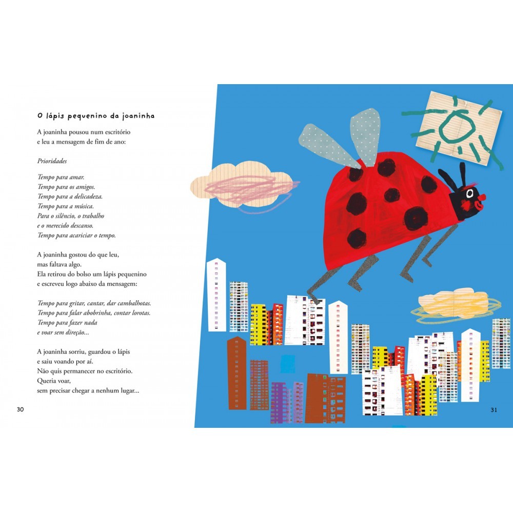 Armas viram bolhas De sabão; um banquinho acha Uma poltrona espaçosa demais; Um carro decide tirar férias; Silas Encontra um selo na sola de seu Sapato; uma joaninha entra num Escritório e lê a mensagem de fim de Ano; uma bola começa a pisar na bola... Ah, quantos versos recheados de Ternura para você saborear sem um Pingo de pressa e, se quiser, Declamá-los com gostosura, Em voz alta, para um mundo De gente ouvir. Editora: Ciranda na Escola Edição: 1, 2025 Autor: Jonas Ribeiro Ilustrador: Fê Idioma: Português Páginas: 40 Dimensões: L 20.50 x A 27.50 x E 0.40 ISBN: 9786553845640 Coleção: Não se aplica Linha Editorial: Ciranda na Escola - Literatura infantojuvenil Faixa Etária: + 6 anos Assuntos (tags): Afeto, Acolhimento, Carinho, Poesia BISAC: Poesia / Assuntos & Temas Linha de Produto: Literatura infantil Encadernação: Brochura Acabamento: Laminação fosca Material: Papel