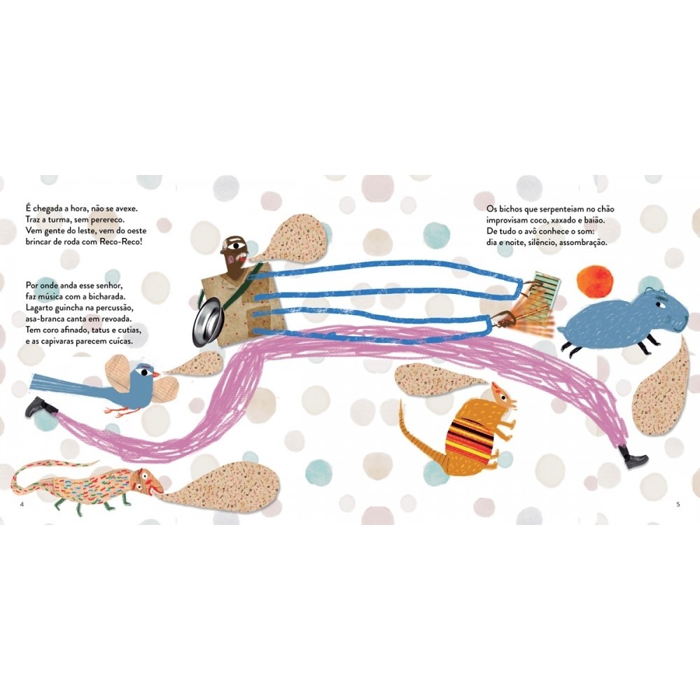 Serrote, chaleira, talo de mamoeiro, bacia, tampa de panela, triângulo, pandeiro feito com tampas de garrafas, matraca que imita o rabo da jararaca: A sinfonia do Reco-Reco está pronta para a estreia. Vem gente de todo canto para aprender a construir instrumento com qualquer coisa, treco, geringonça. Na fartura de ritmo desse vovô sabido, não tem desperdício! Agora é sua vez de entrar para o fuzuê, imitando o coaxar dos sapos e o assobio da zabelê. Editora: Ciranda na Escola Edição: 1, 2024 Autor: Penélope Martins, Gabriela Romeu Ilustrador: Fê Idioma: Português Páginas: 32 Dimensões: L 24.00 x A 24.00 x E 0.33 ISBN: 9786553843967 Coleção: Não se aplica Linha Editorial: Ciranda na Escola - Literatura infantojuvenil Faixa Etária: + 6 anos Assuntos (tags): Rimas, Memória afetiva, Invenção, Habilidades, Tempo BISAC: Família & Relacionamentos / Parentesco / Avós Linha de Produto: Literatura infantil Encadernação: Brochura Acabamento: Laminação fosca Material: Papel